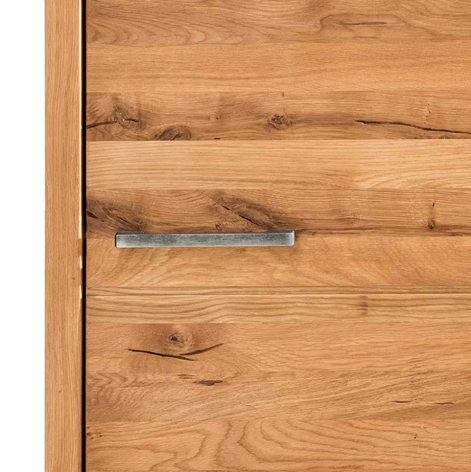 Die Echtholz-Oberfläche des Schranks ist mit Wuchsrissen und Astlöchern versehen und natürlich geölt, was ihm einen rustikalen Charme verleiht. Der Schrank ist mit einer großen Drehtür ausgestattet, die eine Softclose-Funktion aufweist und durch stabile Metallscharniere unterstützt wird. Der praktische Metall-Bügelgriff ermöglicht ein bequemes Öffnen und Schließen der Tür.