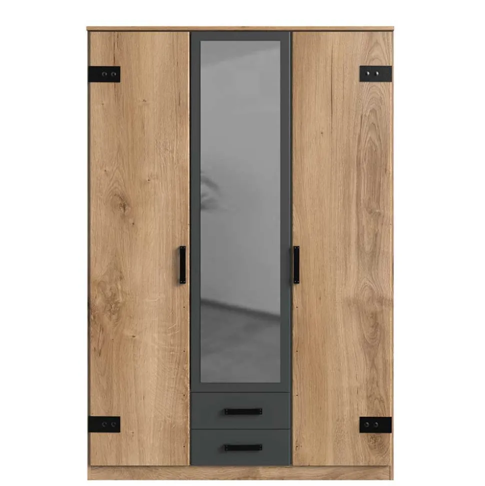 Die Möbel sind aus Spanplatte gefertigt und mit einer Folierung in Plankeneiche Dekor und Dunkelgrau versehen. Metallteile sind in Dunkelgrau oder Schwarz pulverbeschichtet, und der Schlafzimmerschrank verfügt über ein Spiegelglas-Element. Robuste Metallbeschläge und Auszüge sorgen für Langlebigkeit und Stabilität.