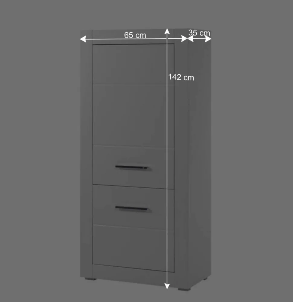 Mit einer Breite von 65 cm, einer Höhe von 142 cm und einer Tiefe von 35 cm fügt sich der Schrank harmonisch in verschiedenste Wohnsituationen ein – ob im Wohnzimmer, Flur oder Schlafzimmer. Trotz seiner schlanken Maße bietet er erstaunlich viel Stauraum und trägt durch sein helles, glänzendes Finish dazu bei, Räume größer und freundlicher wirken zu lassen.