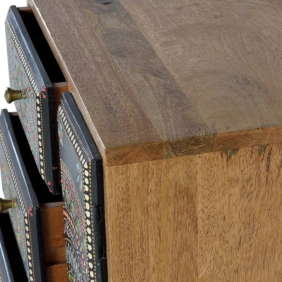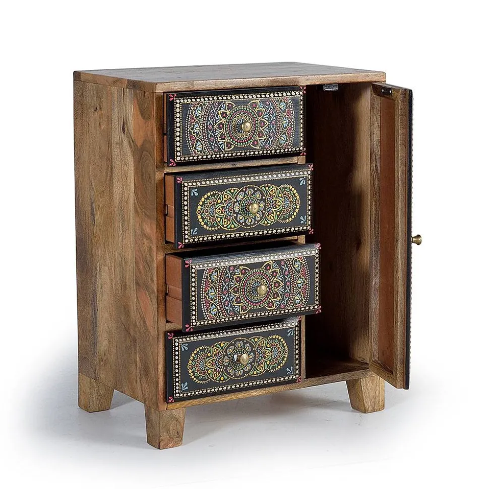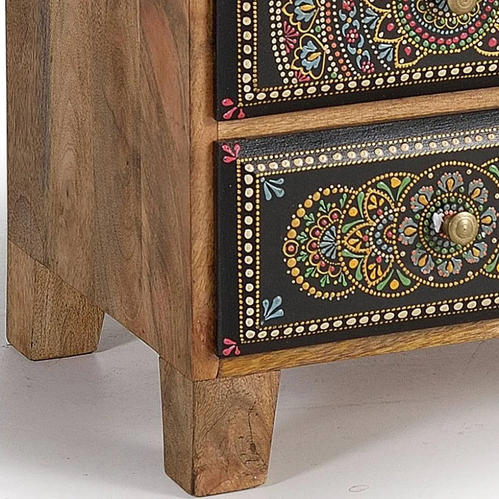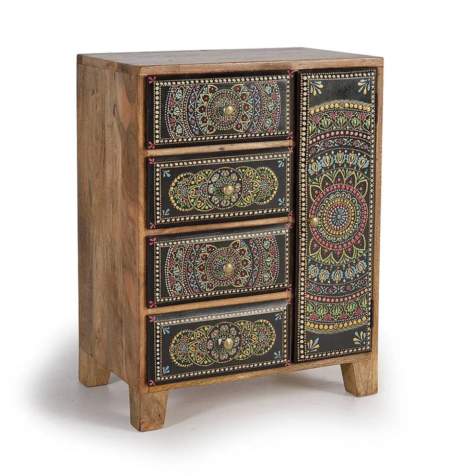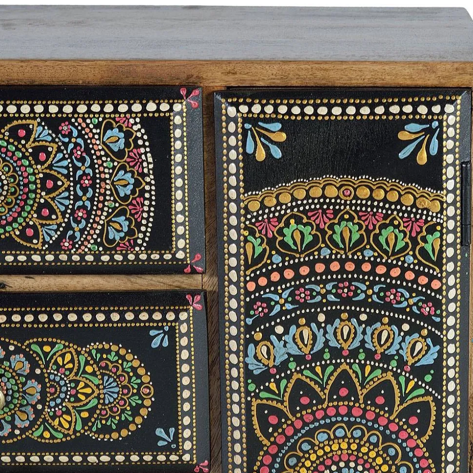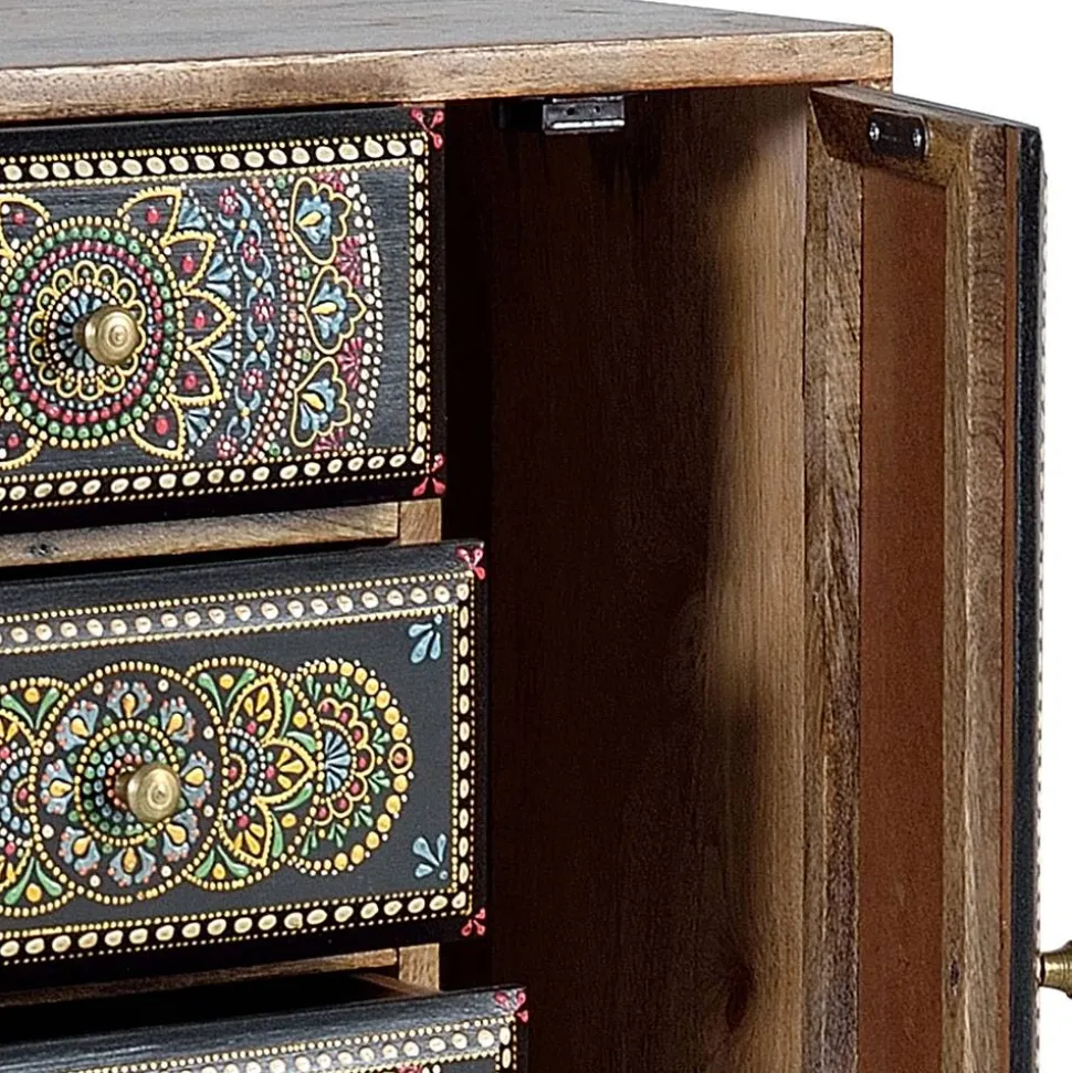 Verleihen Sie Ihrem Raum einen einzigartigen Charme mit der Kombi Kommode „Marike“. Mit ihrem stilvollen, orientalischen Design und der Kombination aus natürlichen Mangoholzfarben und schwarzem Finish wird sie garantiert zum Blickfang in jedem Raum. Die kunstvoll handbemalten Mandala-Motive auf der Front der Schubladen verleihen der Kommode eine ganz besondere Note. Jedes Stück ist ein Unikat, da Farbe und Struktur in Handarbeit variieren können. So erhalten Sie ein Möbelstück, das es in dieser Form kein zweites Mal gibt – perfekt für Liebhaber individueller Einrichtung.
