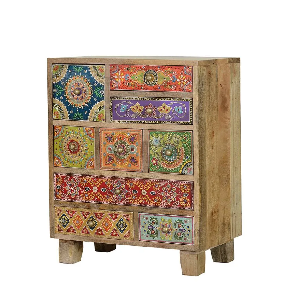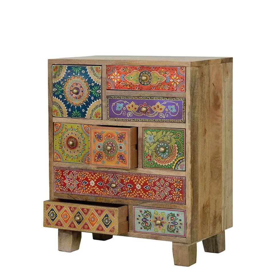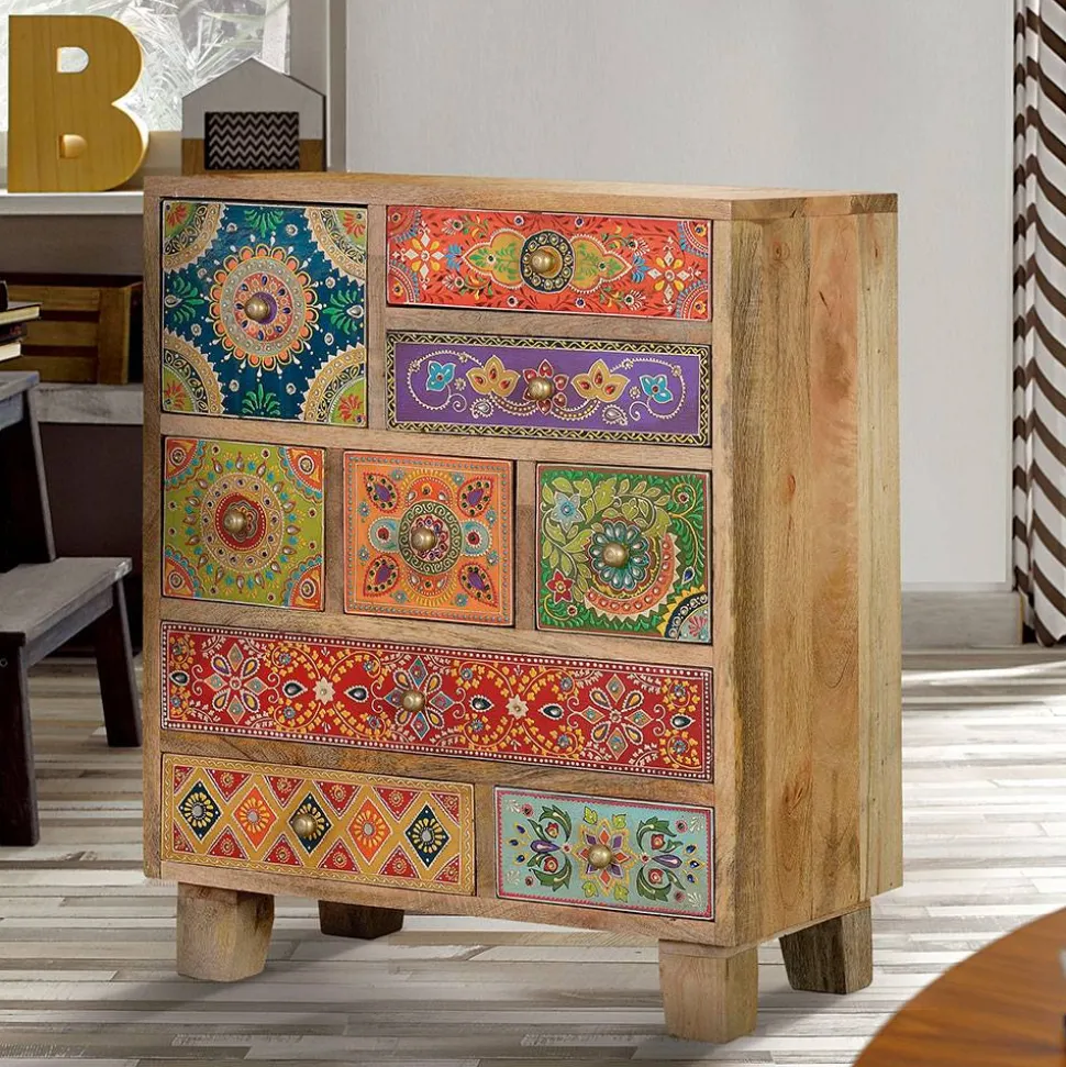 Mit der Kommode „Edro“ zieht ein echtes Unikat in Ihr Zuhause ein! Gefertigt aus massivem Mangoholz, beeindruckt dieses Möbelstück mit seiner charaktervollen Optik und verspielten Details. Die neun unterschiedlich gestalteten Schubladen setzen farbenfrohe Akzente und machen „Edro“ zum Blickfang in jedem Wohnbereich. Perfekt für ein gemütliches Boho-Ambiente, bringt diese Kommode Wärme, Individualität und praktische Funktion in Ihr Zuhause.