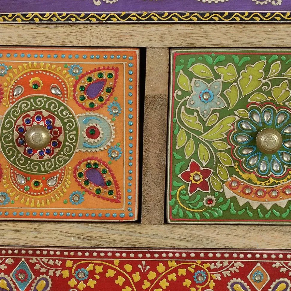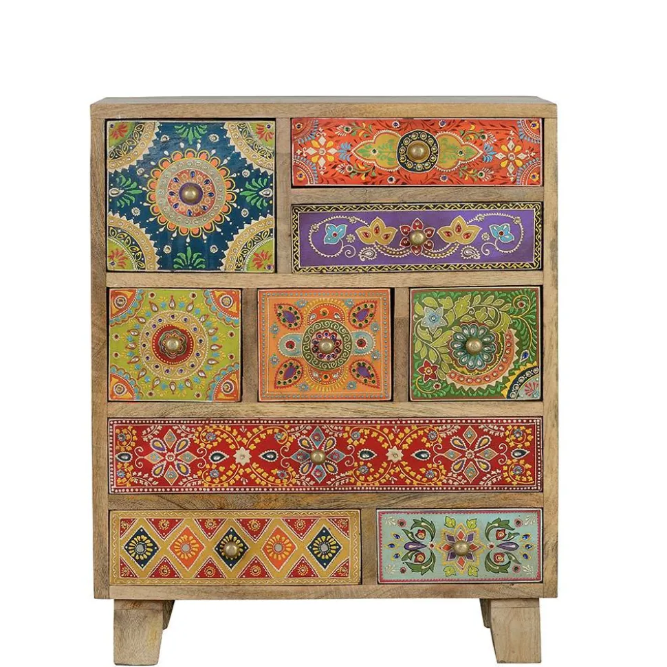 Die Schubladenfronten sind wahre Kunstwerke: Unterschiedliche Muster, Ornamente und farbliche Nuancen verleihen jeder Schublade ihren eigenen Charakter. Die runden Metallknöpfe in Altmessing-Optik unterstreichen den charmanten Vintage-Look. Dank der unterschiedlichen Größen der Schubladen bietet die Kommode vielseitige Stauraummöglichkeiten – ideal, um kleine Alltagsgegenstände stilvoll zu verstauen.
