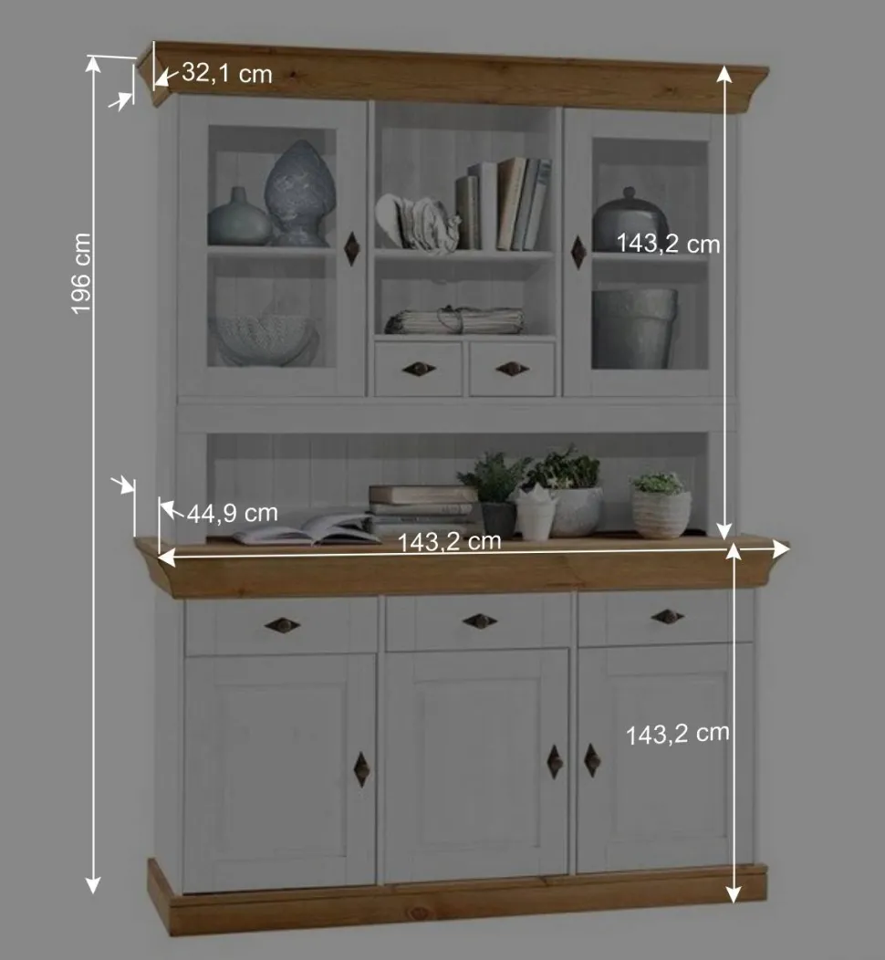 Mit einer Breite von 144 cm, einer Höhe von 195,8 cm und einer Tiefe von 45 cm ist der Buffetschrank „Sibiuta“ ein wahres Stauraumwunder. Der Aufsatz überzeugt mit zwei massiv gerahmten Glastüren, hinter denen zwei Einlegeböden Platz für Ihre Schätze bieten. Zwischen diesen Glastüren finden sich zwei kleine, offene Fächer, ideal für Dekorationen oder Alltagsgegenstände. Unter den Glastüren besticht ein breites offenes Fach mit einer Höhe von 26,5 cm, gefolgt von zwei kleineren Schubkästen. Die untere Sektion des Schrankes beherbergt drei Türen im dekorativen Kassettenlook, hinter denen sich weitere drei Einlegeböden verbergen. Drei großzügige Schubladen im unteren Teil und zwei kleine Schubladen im Ausatz sind mit einem praktischen Metallauszug, sorgen für komfortables Öffnen und Schließen. Abgerundet wird das Design durch die edlen Knopfgriffe mit Metallbeschlag an den Schubladen und Türen.