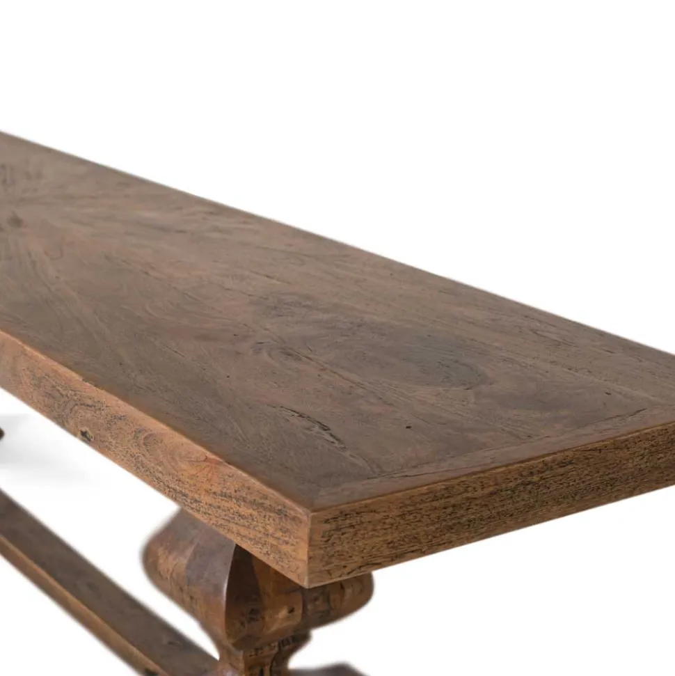 Die Bank besteht vollständig aus massivem Mangoholz, einem langlebigen und robusten Material, das für seine besondere Farbgebung und Struktur bekannt ist. Das gedrechselte Fußgestell mit zwei eleganten Säulen unterstreicht den charmanten Landhausstil und verleiht der Bank eine standfeste Basis. Durch die Handarbeit bei der Fertigung entstehen einzigartige Details, die jedes Stück zu einem Einzelstück machen.