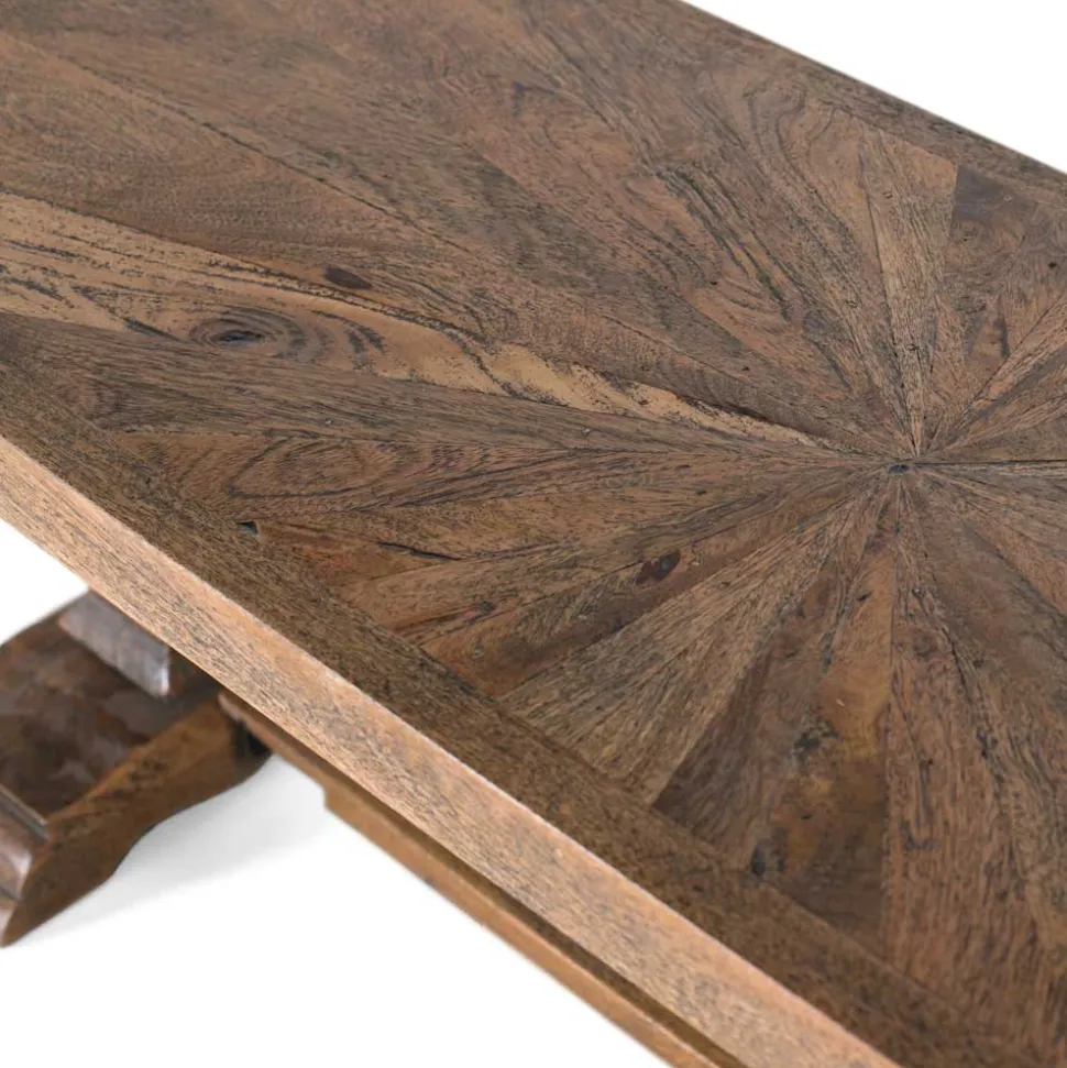 Verleihen Sie Ihrem Essbereich eine unverwechselbare Note mit der Esstischbank „Valdiza“. Hergestellt aus massivem Mangoholz begeistert dieses Möbelstück mit einer natürlichen Ausstrahlung, die Wärme und Behaglichkeit in Ihre vier Wände bringt. Die Oberfläche ist naturbelassen, wodurch die individuelle Maserung und Struktur des Holzes perfekt zur Geltung kommen. Besonders beeindruckend: Die Sitzfläche ist mit kunstvollen Intarsien in einer strahlenförmigen Gestaltung versehen – ein handgefertigtes Unikat, das für stilbewusste Individualität steht.