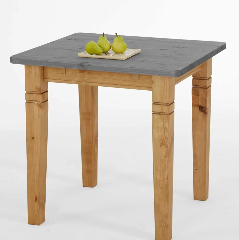 Der wohnliche Esstisch Viensta ist der perfekte Tisch für jedes Esszimmer im Landhaus-Stil. Er wird aus massiver Kiefer gefertigt und hat eine quadratische Grundform. Die Tischplatte ist ca. 3 cm stark und in Laugenfarben gebeizt und geölt, sowie in Grau lackiert, wodurch die Holzmaserung sichtbar wird. Die Kanten sind abgerundet, um ein angenehmes Gefühl beim Sitzen zu gewährleisten.