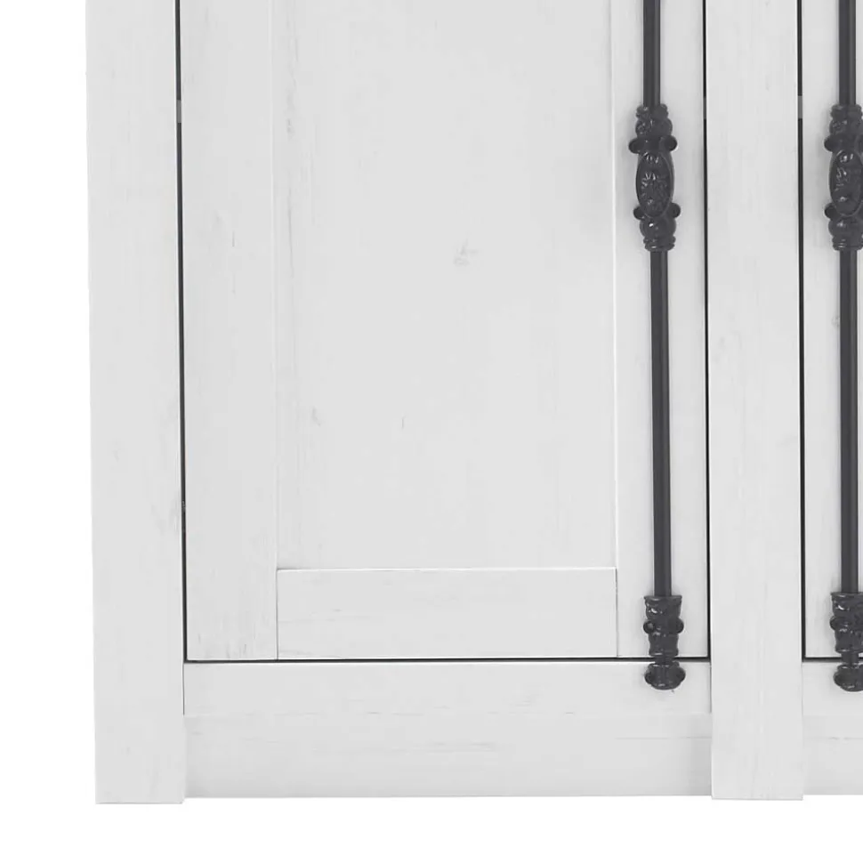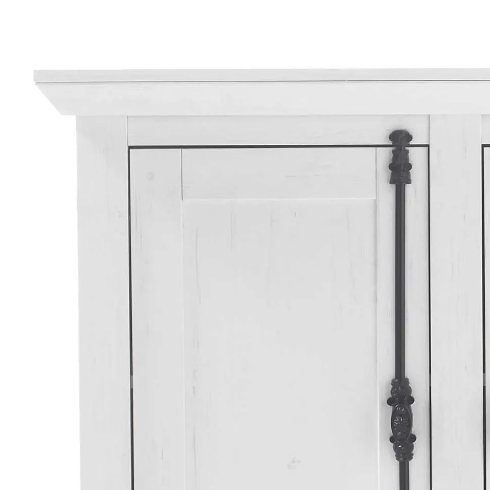 Die beiden Türen in Kassettenoptik öffnen den Blick in ein geräumiges Innenleben mit festen Ablageböden. Mit Fachmaßen von je ca. 37x35x35 cm haben Sie genügend Raum, um Ihre Gegenstände geordnet zu platzieren. Die rustikalen Stangengriffe aus schwarzem Metall setzen zudem einen optischen Kontrast und runden das Gesamtbild perfekt ab.