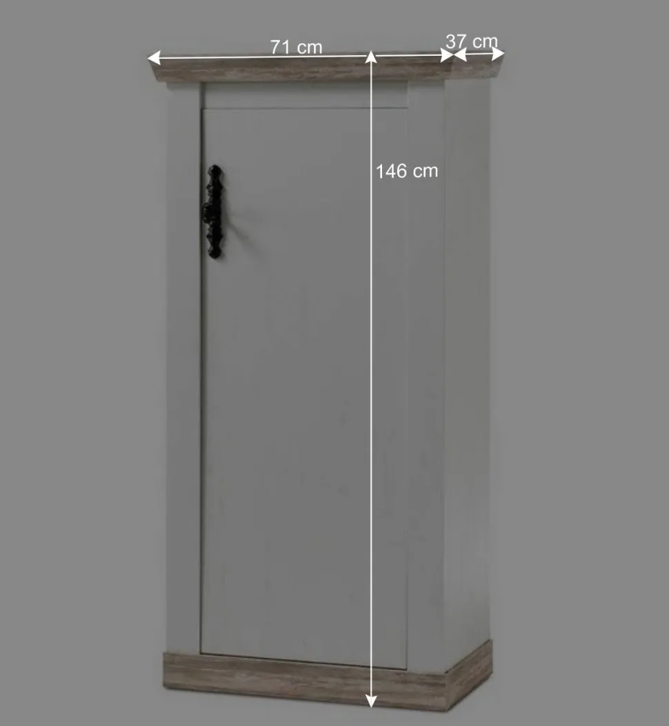 Die Möbelstücke sind aus robuster Spanplatte gefertigt und verfügen über Oberflächen in Holzoptik Weiß, die durch Kranzleisten und Sockel in Pinie verwittert foliert abgesetzt werden. Diese zweifarbige Optik verleiht dem Set eine einzigartige Ausstrahlung und sorgt dafür, dass es in jedem Wohnzimmer zum Blickfang wird. Selbst die sichtbaren Rückwände sind farblich abgesetzt und tragen zur Gesamtwirkung bei.
