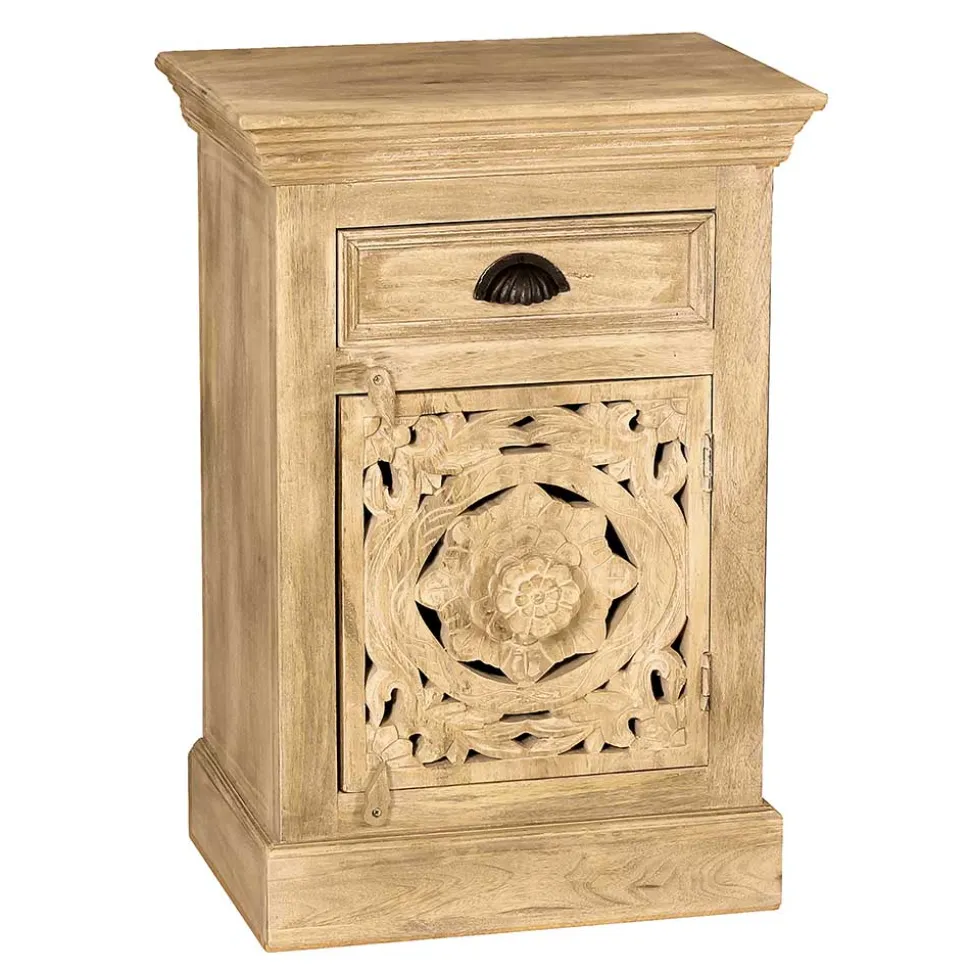Die Front der Tür ist aufwendig mit zauberhaften floralen Motiven versehen, die von Hand beschnitzt wurden. Ein hübscher Holz-Knopfgriff in Blütenform und kleine Holzknebel zum Verschließen runden das liebevolle Design ab. Hinter der Tür befindet sich ein großer Stauraum, der genügend Platz für all Ihre Badutensilien bietet.