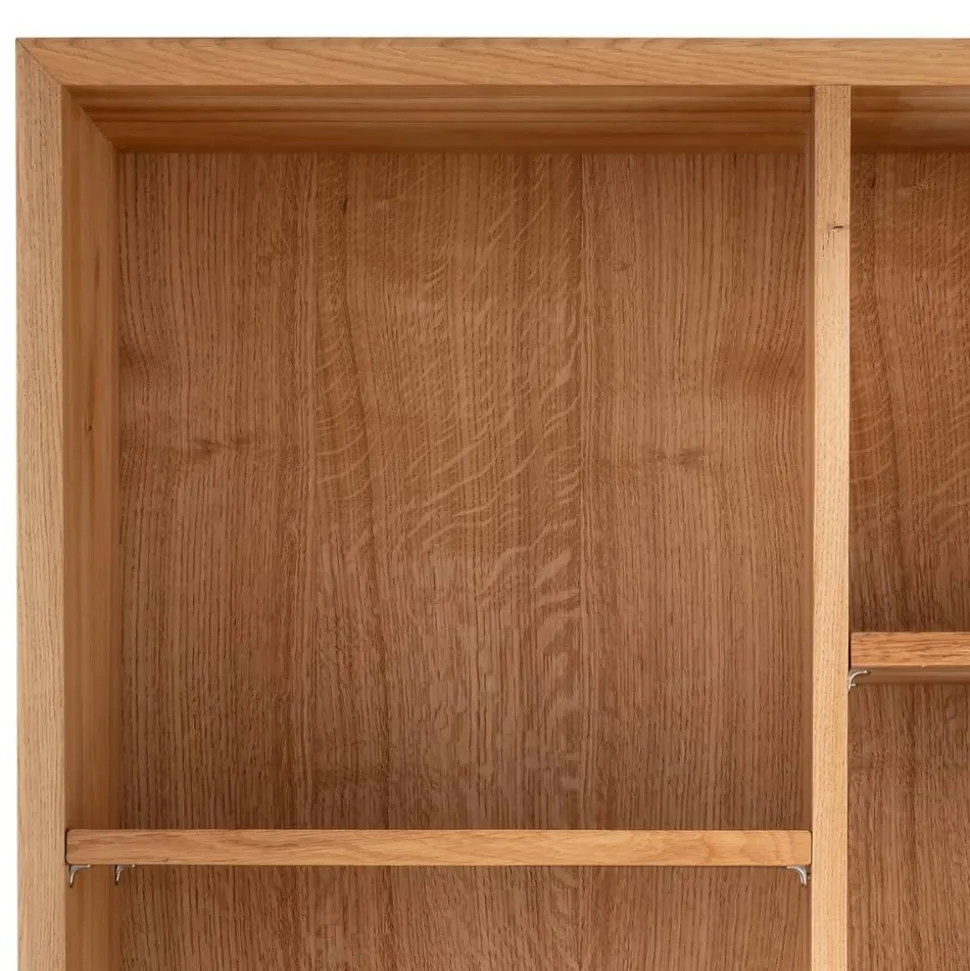Mit fünf Einlegeböden bietet das Regal eine raffinierte Innenstruktur: Drei größere Fächer auf der linken Seite und vier kleinere rechts schaffen Platz für Bücher, Deko oder Alltagsgegenstände. Die stabile Unterkonstruktion aus Massivholz mit vier formschön gestalteten Füßen sorgt für sicheren Stand – dennoch wird empfohlen, das Möbel zusätzlich an der Wand zu fixieren, um maximale Kippsicherheit zu gewährleisten.