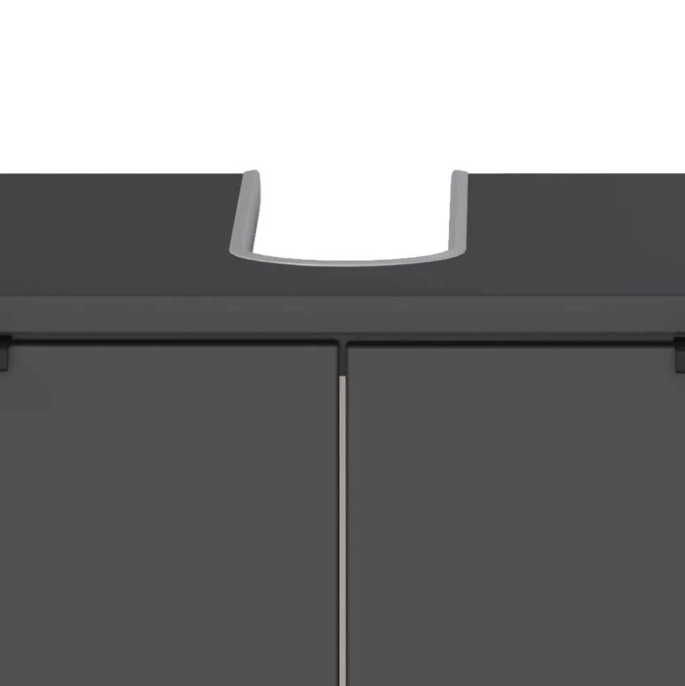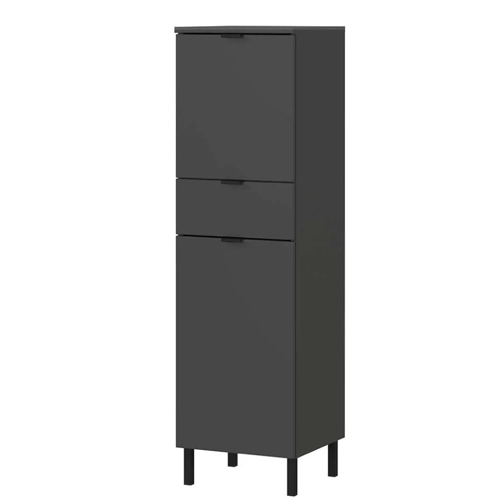 Tauchen Sie ein in zeitlose Eleganz mit der Badmöbel Kombi „Quado“, deren Design in elegantes Dunkelgrau getaucht ist. Dieses dreiteilige Set aus hochwertigem Holzwerkstoff und edlem Spiegelglas verleiht Ihrem Badezimmer nicht nur eine ästhetische Note, sondern überzeugt auch mit praktischen Merkmalen.