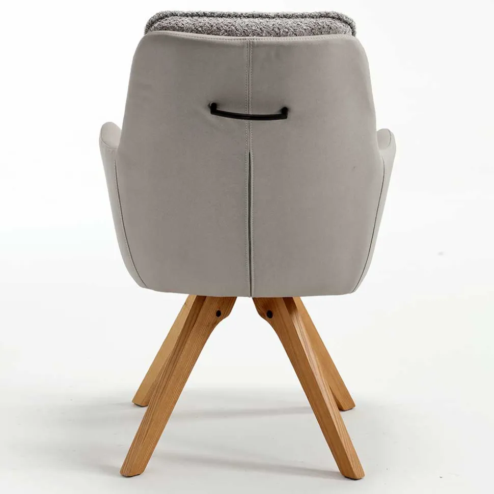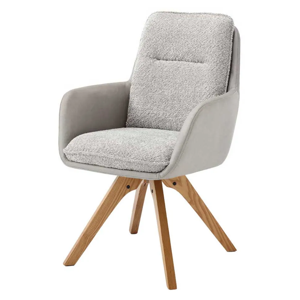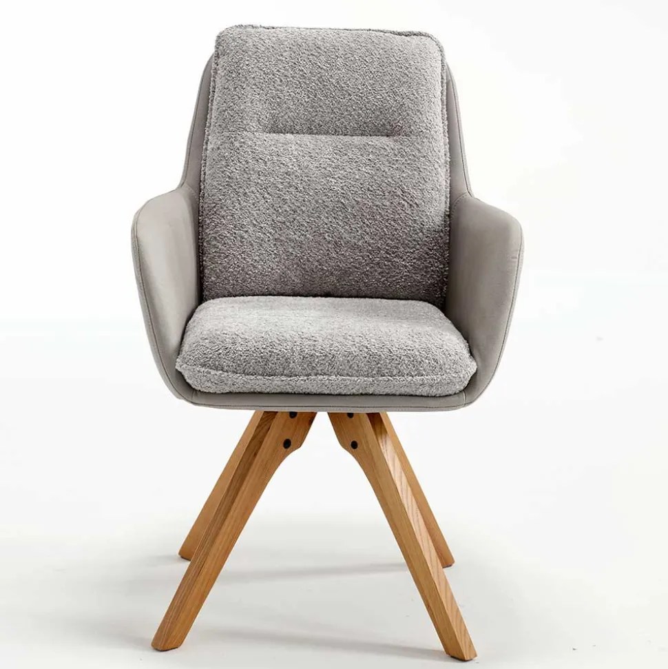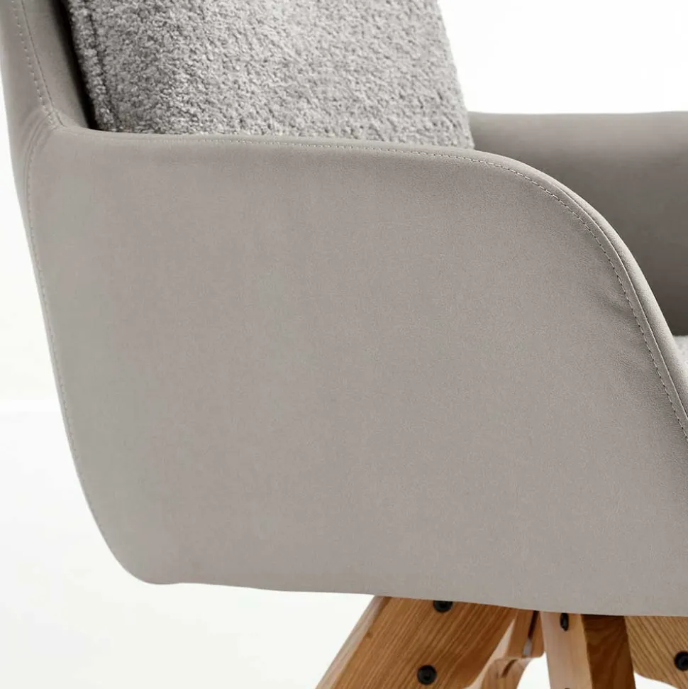 Bouclé, bekannt für seine gekräuselte und weiche Textur, überzieht die Hauptkontaktflächen des Stuhls und bietet eine einladende, gemütliche Sitzfläche, die Sie nicht mehr verlassen möchten. Der graue Kunstlederbezug der Armlehnen und Außenseiten fügt eine luxuriöse, pflegeleichte Komponente hinzu, die nicht nur attraktiv aussieht, sondern auch im täglichen Gebrauch robust und leicht zu reinigen ist.