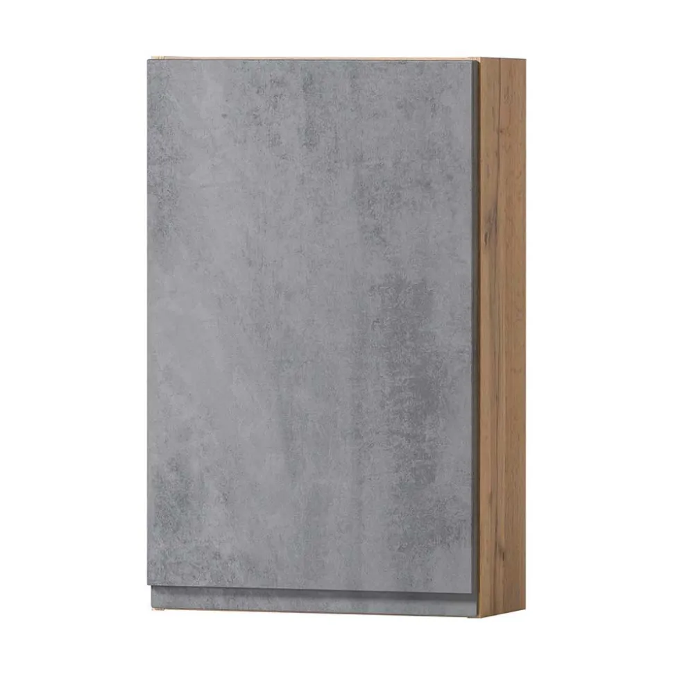 - Korpus mit Melaminbeschichtung in Holzoptik, Fronten tiefgezogen betongrau foliert