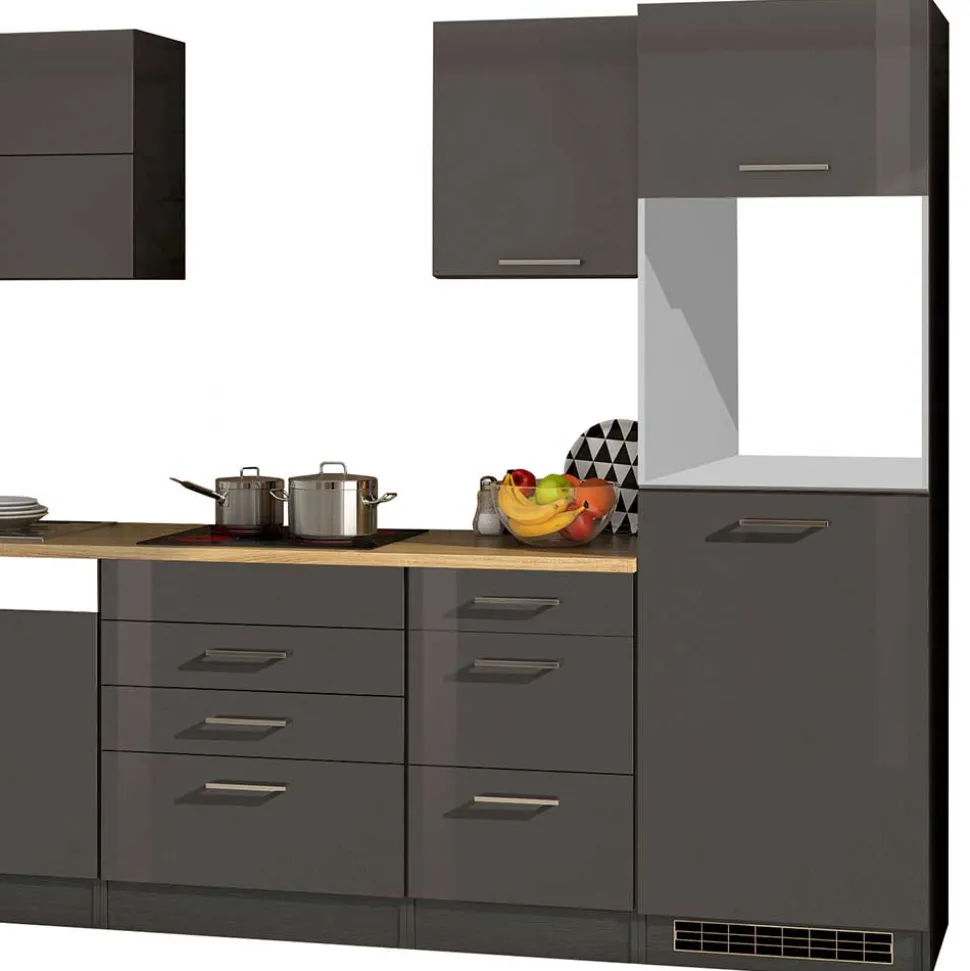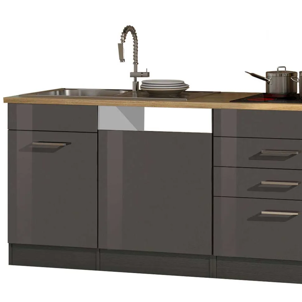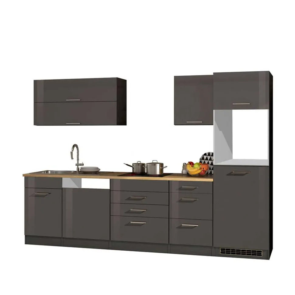 MDF kommt bei den Fronten zum Einsatz – ein bewährtes Material, das sich durch seine hohe Formstabilität und glatte Oberfläche auszeichnet. Diese Eigenschaften bilden die ideale Grundlage für die edle Hochglanz-Folierung in Grau. Diese Folie verleiht der Oberfläche nicht nur Glanz und Eleganz, sondern schützt auch dauerhaft vor Feuchtigkeit, Abrieb und Verschmutzungen. Der Korpus wird aus robuster Spanplatte gefertigt, die Stabilität und Tragkraft zuverlässig vereint. Die Arbeitsplatte beeindruckt mit einer authentischen Holzoptik in Sonoma Eiche. Ihre melaminbeschichtete Oberfläche macht sie hitzebeständig, kratzfest und einfach zu reinigen. Diese Kombination aus hochwertigen Trägermaterialien und widerstandsfähigen Oberflächen sorgt dafür, dass diese Küche auch im hektischen Alltag ihre Schönheit und Funktionalität behält.