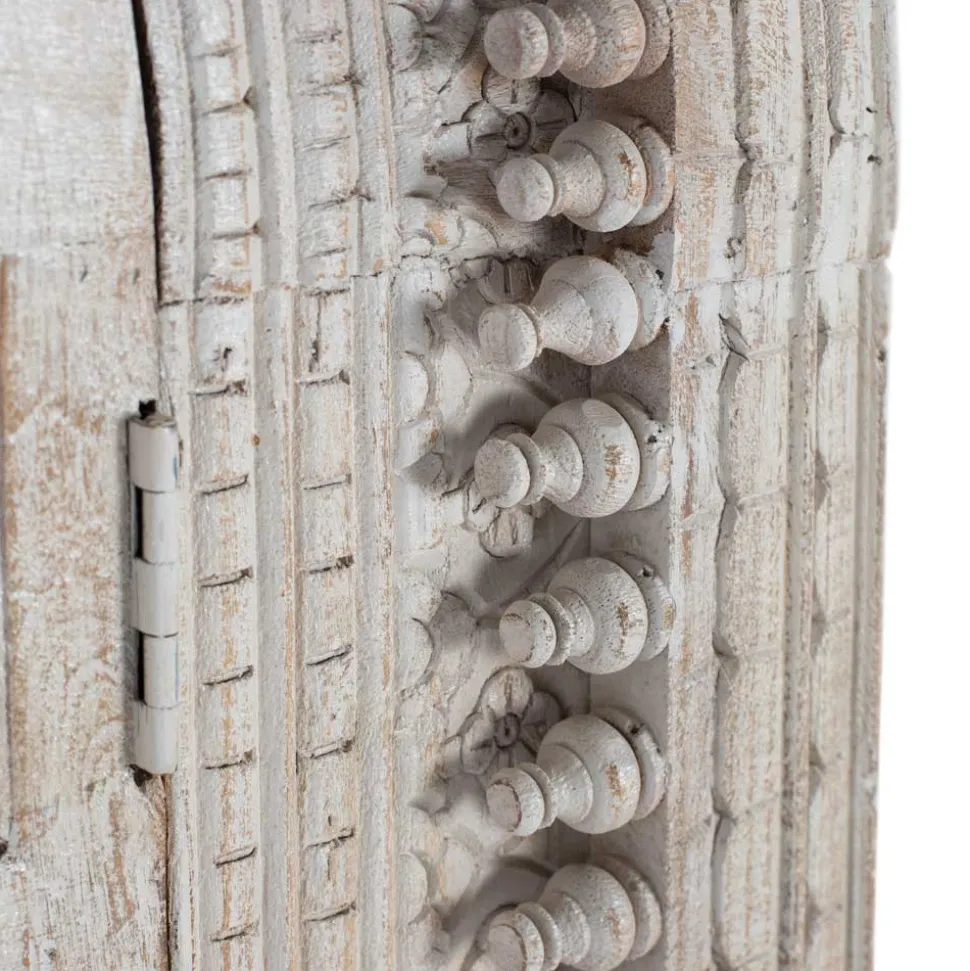 Der „Capo“-Schrank begeistert mit seiner soliden Konstruktion und hochwertigen Materialwahl. Das massive Mangobaumholz verleiht dem Möbelstück nicht nur Stabilität, sondern auch eine natürliche Ausstrahlung. Die Oberfläche wurde mit einem zarten White Wash Effekt behandelt, wodurch eine ansprechende, leicht antike Optik entsteht. Zwei stabile Türen, versehen mit robusten Metallscharnieren, sorgen für eine lange Lebensdauer. Die handlichen, metallenen Bügelgriffe in Antikweiß runden das Gesamtbild ab und bieten gleichzeitig eine angenehme Haptik. Das massives Holzsockelgestell bringt den Schrank sicher in Position und unterstreicht seinen stilvollen Look. Ein weiteres Highlight sind die filigranen Ornamentmuster und die kunstvollen Zierfräsungen, die durch ihre präzise Ausführung das handwerkliche Können zur Geltung bringen. Diese Details machen den „Capo“ zu einem wahren Schmuckstück.