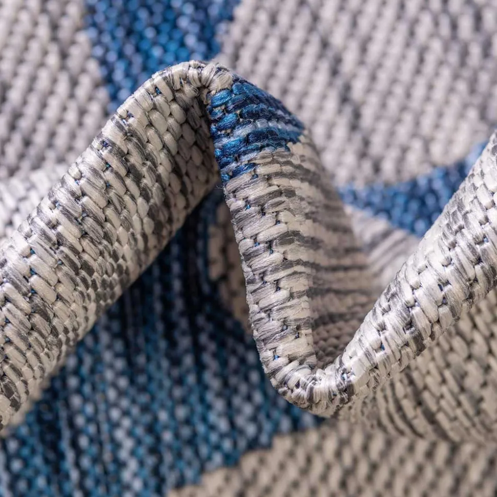 Der Outdoor Webteppich aus PP „Elsaro“ bringt mit seinem hellgrauen Grund und der großflächigen Ornament-Musterung in Blau eine luftige Eleganz in Ihre Wohn- und Außenbereiche. Das Design wirkt wie eine moderne Interpretation klassischer Fliesenmotive und entfaltet seine Wirkung besonders gut in offenen Raumkonzepten – ob auf der Terrasse, im Wintergarten oder im Wohnzimmer. Die kühle Farbgebung sorgt für Klarheit und Ruhe, während das Muster dekorative Tiefe verleiht.
