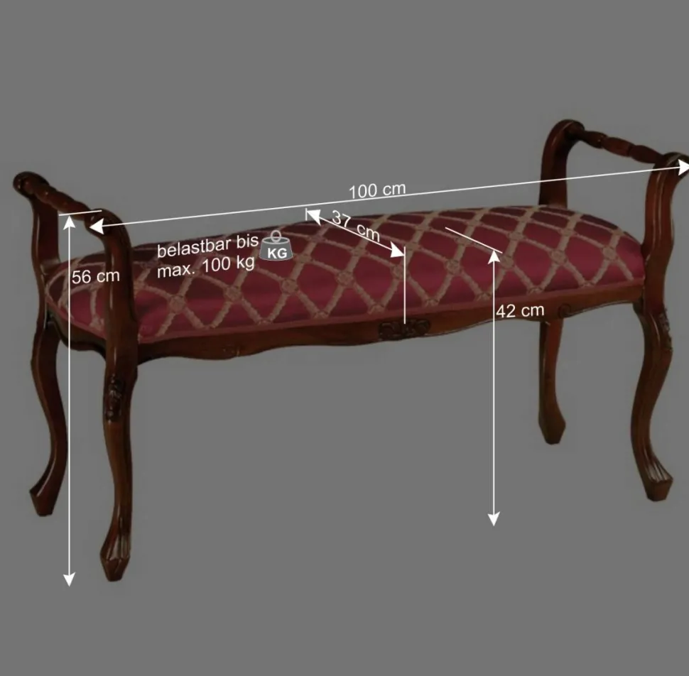 Mit einem kunstvoll verzierten, massiven Vierfußgestell in leicht gebogener Form steht die Polsterbank „Magari“ stabil und sicher. Eine maximale Belastbarkeit von 100 kg zeigt, wie robust dieses elegante Möbelstück ist.