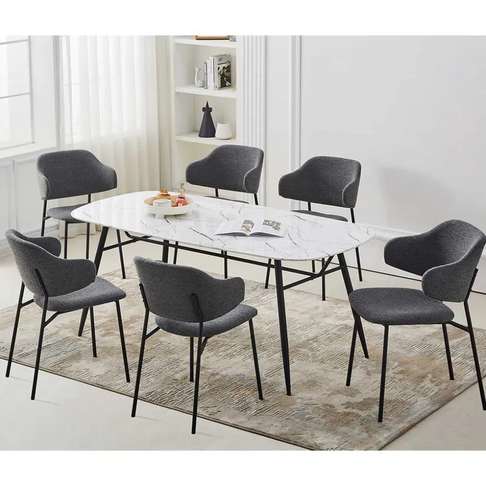 Der Bezug besteht aus edlem Bouclé-Stoff, der mit seiner weichen, strukturierten Oberfläche eine besondere Haptik bietet. Gefertigt aus 100 % Polyester, ist das Material nicht nur angenehm im Sitzgefühl, sondern auch äußerst strapazierfähig – mit einer Scheuerbeständigkeit von 35.000 Touren nach Martindale. Die Sitzfläche und Rückenlehne sind mit einer hochwertigen Schaumstoffpolsterung ausgestattet, die optimalen Komfort verspricht. Das schwarz pulverbeschichtete Metallgestell sorgt für Stabilität und unterstreicht den modernen Look der Stühle.