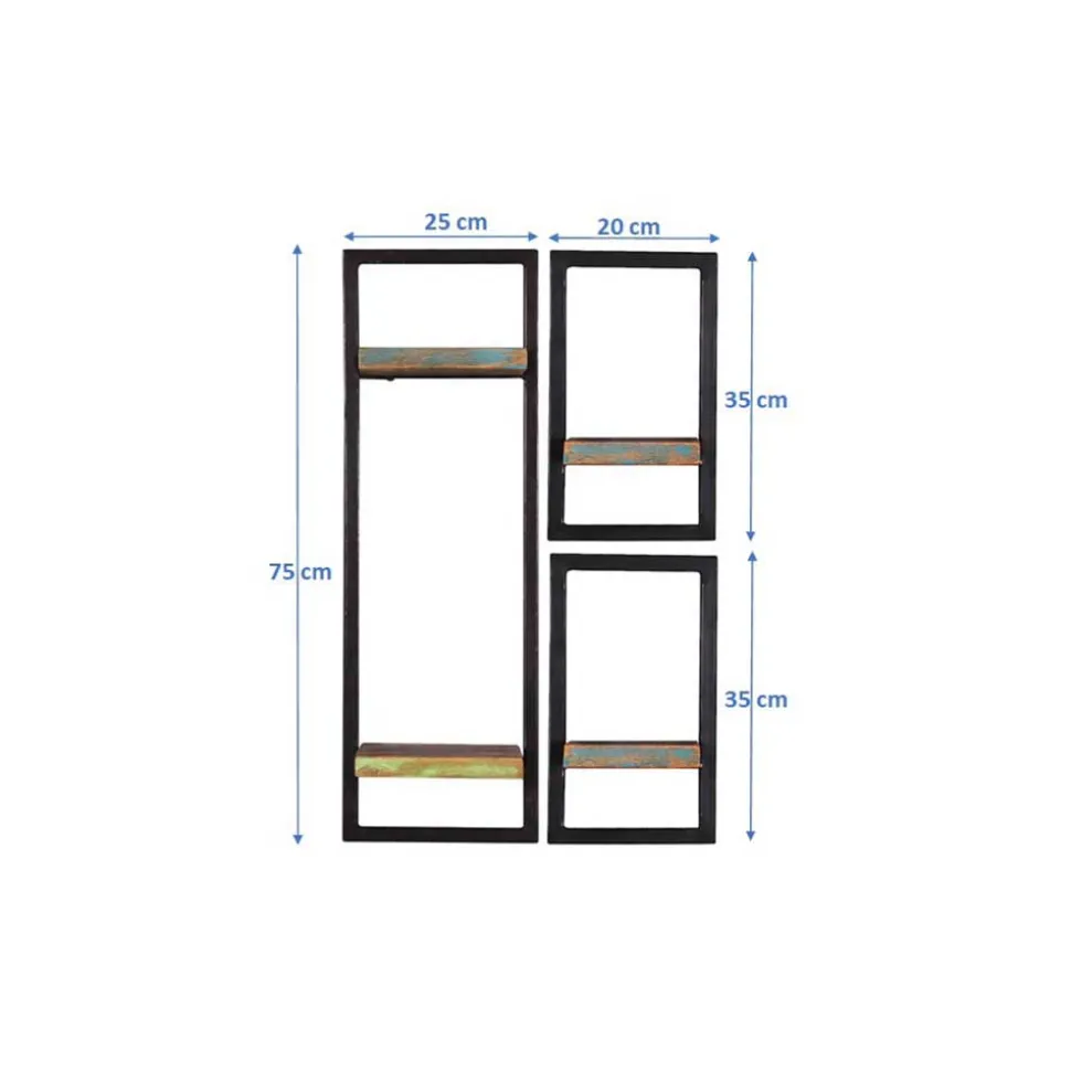 Die Regale können nach Belieben positioniert werden, um Ihren individuellen Bedürfnissen gerecht zu werden. Schwarze Metallrahmen sorgen nicht nur für einen visuellen Kontrast zum Recyclingholz, sondern garantieren auch Stabilität und Langlebigkeit. Hier finden Dekorationen, Bücher oder persönliche Schätze einen stilvollen Platz.