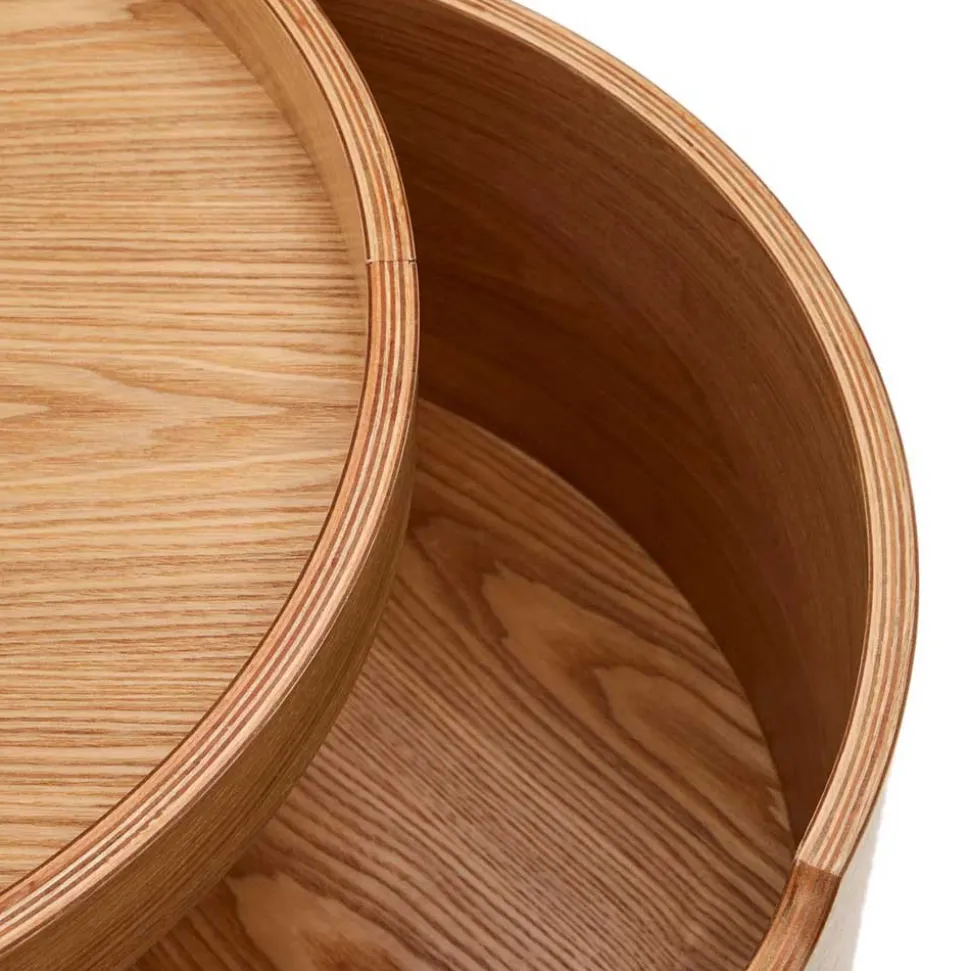 Der Beistelltisch „Raso“ wird aus einer Kombination von Holzwerkstoff (MDF) und Massivholz gefertigt. Seine Oberflächen sind echtholzfurniert mit Esche und anschließend lackiert, was für eine besonders edle Anmutung sorgt. Die Tischplatte verfügt zudem über einen umlaufenden Rand und ist abnehmbar, so dass sie auch als Tablett verwendet werden kann.