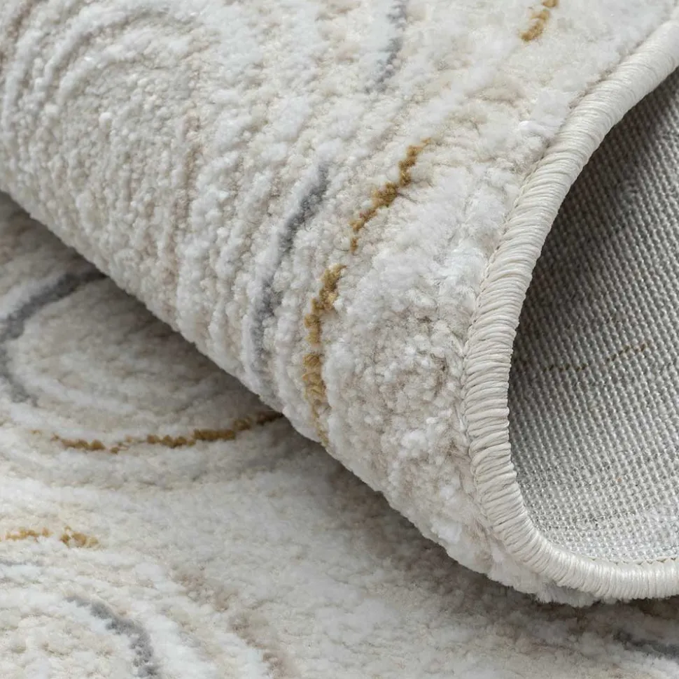 Der runde Teppich „Sesedra“ bringt mit seinem ornamentalen Spiral-Muster und der harmonischen Farbgebung in Creme und Beige eine ruhige, zugleich ausdrucksstarke Note in Ihr Zuhause. Die sanften Töne und das verspielte Design fügen sich mühelos in moderne wie klassische Wohnkonzepte ein – ob als Blickfang im Wohnzimmer, als weicher Akzent im Schlafzimmer oder als stilvolle Ergänzung im Eingangsbereich.