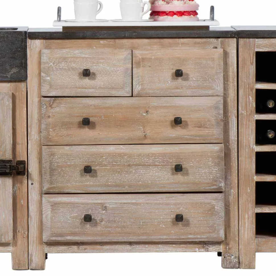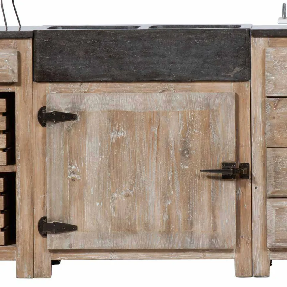 Die Küchenzeile „Ashvills“ besteht aus recyceltem Pinien-Massivholz, Holzwerkstoffen und robustem Naturstein, was für extreme Langlebigkeit sorgt. Die Kombination dieser Materialien verleiht der Küche einen natürlichen und authentischen Charakter, der sich perfekt in jedes rustikale oder Landhaus-Interieur einfügt. Die massiven Deckplatten aus Naturstein sind nicht nur optisch ansprechend, sondern auch widerstandsfähig und pflegeleicht – perfekt für den täglichen Gebrauch. Die schwarzen Metallbeschläge in nostalgischer Optik runden das Gesamtbild harmonisch ab.