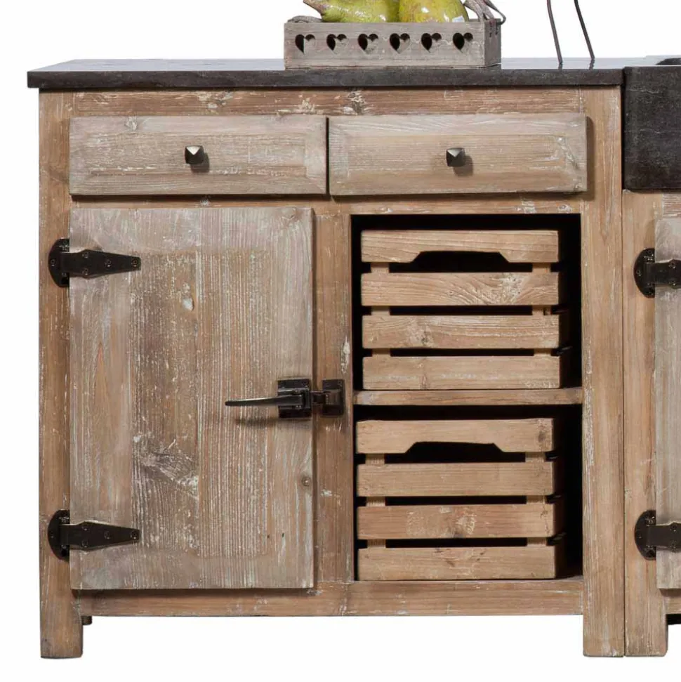Jedes Modul dieser Küchenzeile vermittelt durch die gewollten Gebrauchsspuren und die natürliche Maserung des Pinienholzes einen nostalgischen Charakter, der Ihr Zuhause in eine rustikale Wohlfühloase verwandelt. Dank der hochwertigen Verarbeitung und den liebevoll gestalteten Details wie den schwarzen Metallbeschlägen, fühlt sich die Küche wie ein handgefertigtes Einzelstück an.