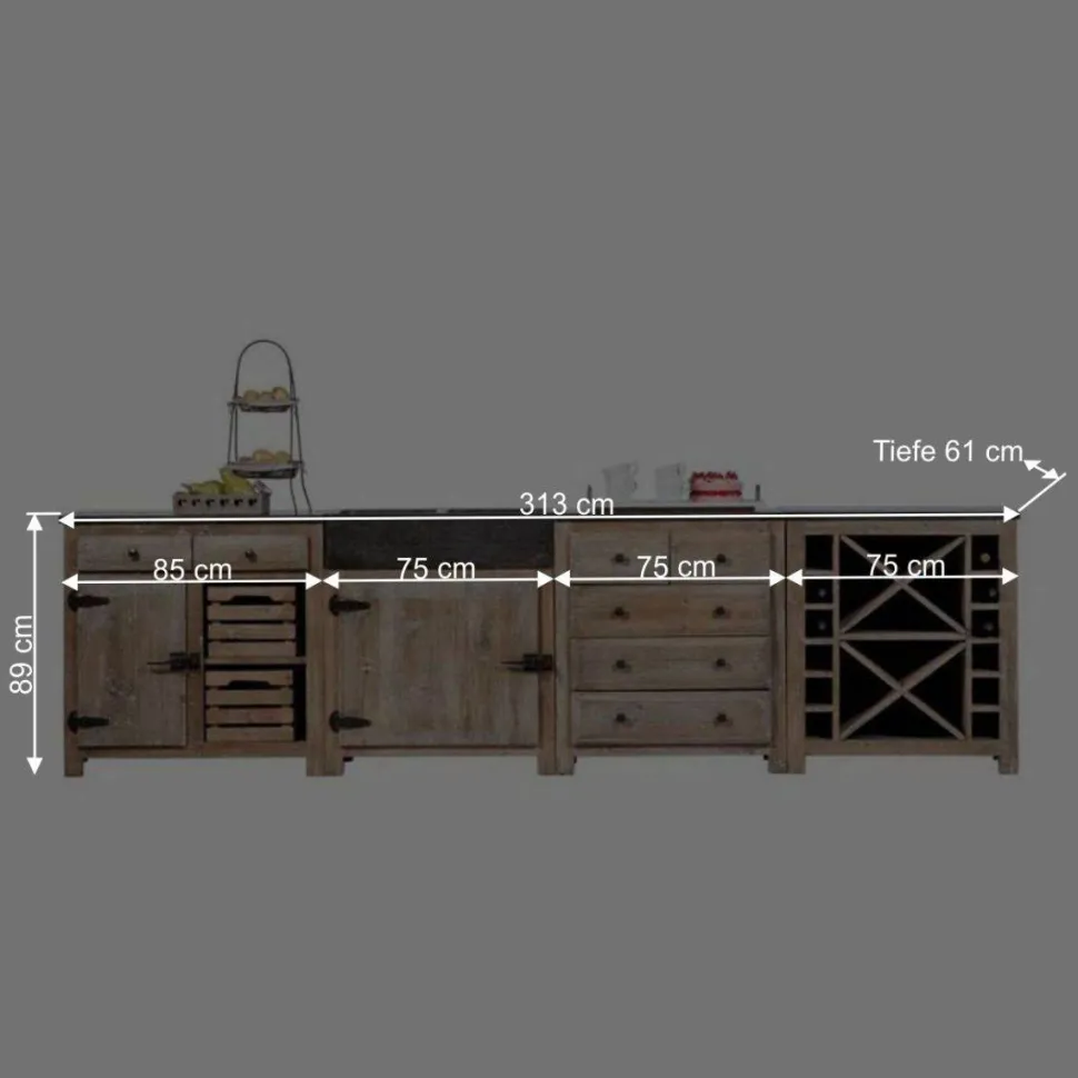 Die Küchenzeile „Ashvills“ ist 313 cm breit, 89 cm hoch und 61 cm tief und besteht aus vier funktionalen Teilen, die beliebig angeordnet werden können, um sich Ihrem Raum und Ihren Bedürfnissen optimal anzupassen.