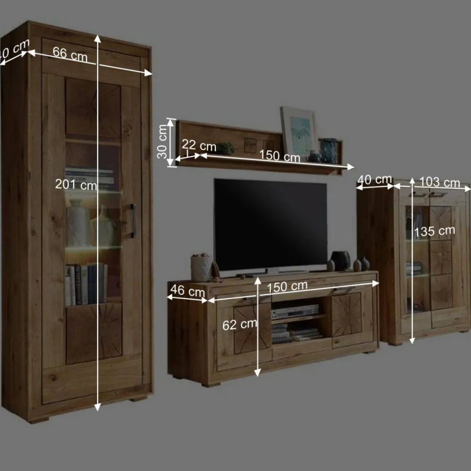 Bei der rustikalen Schrankwand aus Wildeiche massiv Troncon handelt es sich um eine 4-teilige Wohnzimmer Möbel Kombination in Topp-Qualität mit einer Breite von 319 cm. – Zum Set gehören ein TV-Element bzw. Lowboard, ein Highboard, eine Vitrine und ein Wandboard: