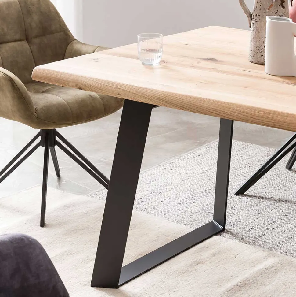 Zavana wirkt gleichzeitig kraftvoll und einladend. Die rechteckige Form mit ca. 4 cm starker Platte und den markanten Baumkanten bringt authentischen Charakter in Ihr Zuhause. Jedes Stück wird direkt aus dem Baumstamm geschnitten, die Tiefe variiert leicht – genau diese Einzigartigkeit macht ihn unverwechselbar. Kombiniert mit dekorativen, schwarz pulverbeschichteten Metall-Bügelgestellen, entsteht ein faszinierender Kontrast zwischen warmem Holz und kühler Industrial-Optik. Dieses Zusammenspiel macht den Tisch zu einem echten Trendmöbel, das Loft-Flair in Ihr Esszimmer bringt.