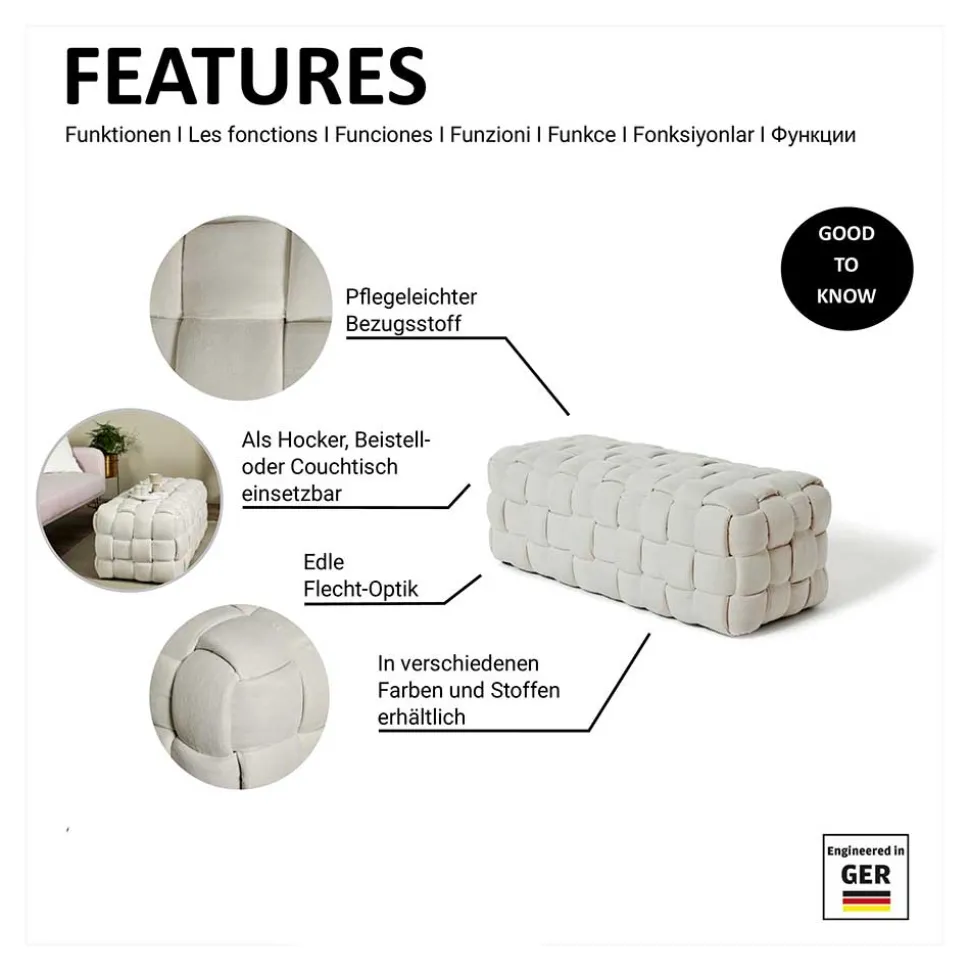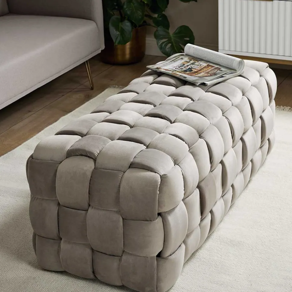 Sie suchen ein Möbelstück, das nicht nur funktional ist, sondern auch durch sein einzigartiges Design überzeugt? Dann ist die Samt-Polsterbank „Josch“ genau das Richtige für Sie! Der sanfte Taupe-Farbton in Kombination mit dem aufwendig gestalteten Flechtdesign macht diese Bank zu einem echten Hingucker. Egal, ob Sie sie im Wohnbereich, Flur oder Schlafzimmer platzieren – die „Josch“ fügt sich mühelos in jede Umgebung ein und bringt modernen Stil in Ihre vier Wände. Dank ihrer rechteckigen Form von 118 cm Länge, 50 cm Breite und 43 cm Höhe lässt sich die Bank sogar als kompakter Couchtisch-Ersatz oder Beistelltisch verwenden.