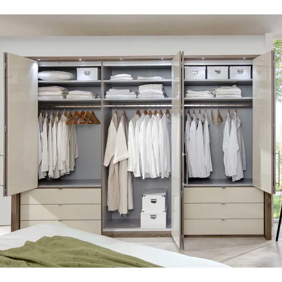 - Drei Panorama-Falttüren, die einfach nach vorne aufgezogen werden (Sechs-Türen-Optik)), dahinter je eine Facheinheit mit je zwei Einlegeböden und einer Kleiderstange