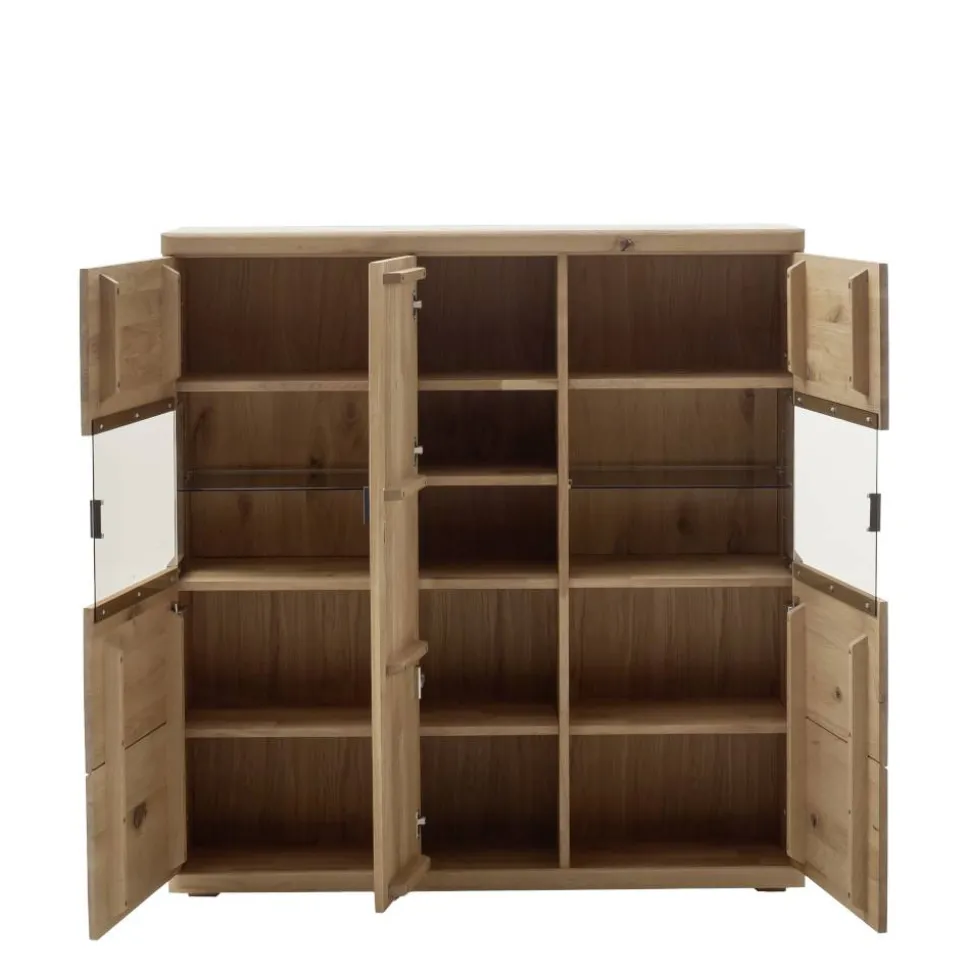 Die Schrankvitrine wird aus astigem Balkeneiche Massivholz gefertigt, dessen helle Oberfläche geölt ist und die lebendige Maserung des Holzes betont. Die Front ist aus durchgehender Lamelle gearbeitet, während der stabile Korpus in robuster Keilzinkung ausgeführt ist. Rückwände mit hellem Echtholzfurnier aus Asteiche werten auch den Innenraum optisch auf, während Parsolglaselemente über Eck den Türen eine elegante Transparenz verleihen. Das mittlere Front-Element wird von einer kunstvoll eingearbeiteten Hirnholzapplikation verziert und unterstreicht die natürliche Qualität des Möbelstücks.