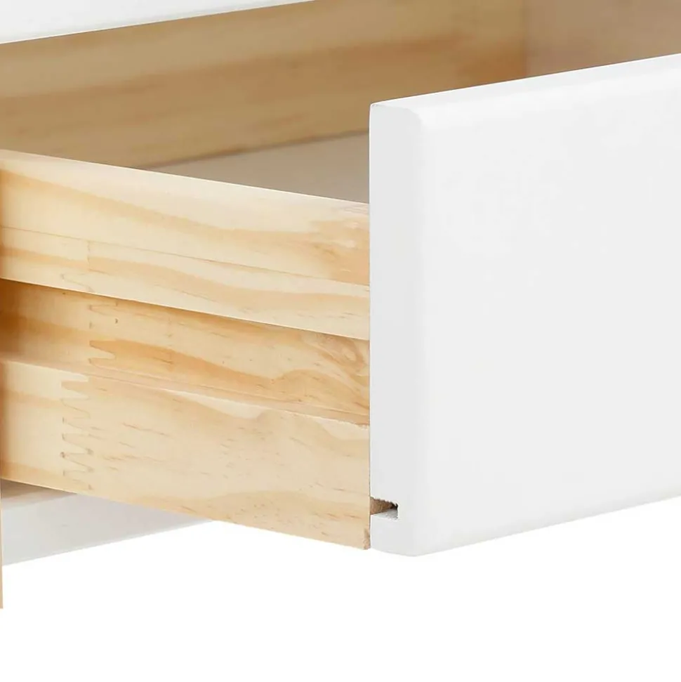 Der Schreibtisch bietet mit zwei Schubladen praktischen Stauraum für Schreibutensilien und Kleinigkeiten. Die Holzauszüge und rund ausgefrästen Grifflöcher in den Schubladenfronten ermöglichen eine einfache Bedienung, während die Innenmaße von je ca. 39,5 x 8 x 32,5 cm für eine optimale Organisation sorgen. Mit einer Belastbarkeit von bis zu 25 kg ist der Schreibtisch auch größeren Anforderungen gewachsen.