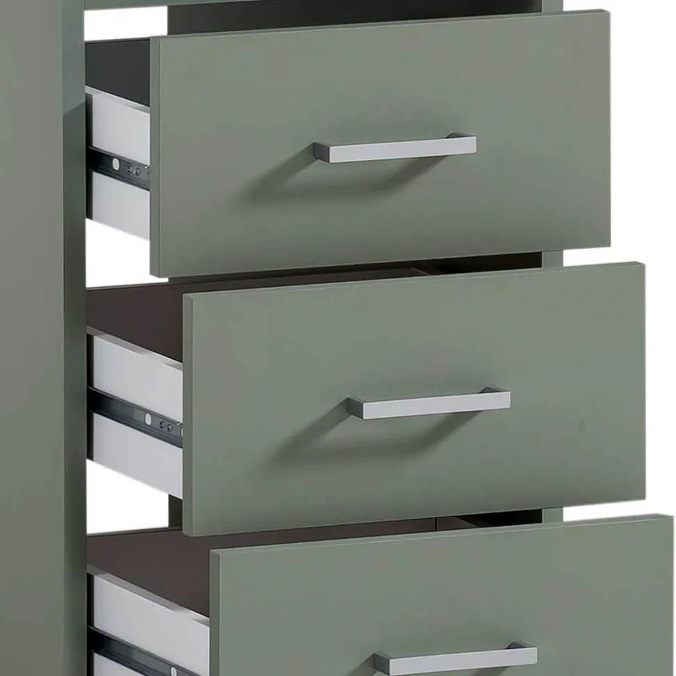 Die klare rechteckige Form und die moderne Oberfläche in Graugrün sorgen für einen frischen, zeitgemäßen Look, der sich harmonisch in unterschiedlichste Einrichtungsstile einfügt. Die melaminbeschichtete Oberfläche sieht nicht nur gut aus, sondern überzeugt auch mit praktischen Eigenschaften: Sie ist besonders pflegeleicht, kratzfest und resistent gegen Feuchtigkeit – ideal für den täglichen Einsatz.