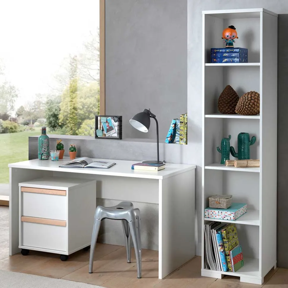 Das dreiteilige Möbelset besteht aus einem Schreibtisch, einem Rollcontainer und einem Regal. Alle Möbel werden aus Holzwerkstoff hergestellt und sind mit strapazierfähigem Melamin in Weiß beschichtet. Die minimalistisch-modernen Griffleisten bestehen aus Massivholz Buche in Natur und verleihen den Möbeln zusätzliche Eleganz.
