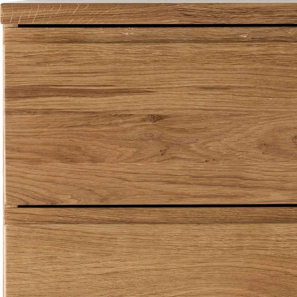 Die fünf Schubladen der Kommode sind mit Metallauszügen ausgestattet und verfügen über eine Soft-Close-Funktion sowie einen Selbsteinzug, was für einen leisen und sanften Schließmechanismus sorgt. Die dezent ausgefrästen Griffmulden runden das ästhetische Design ab und sorgen für eine einfache Handhabung.