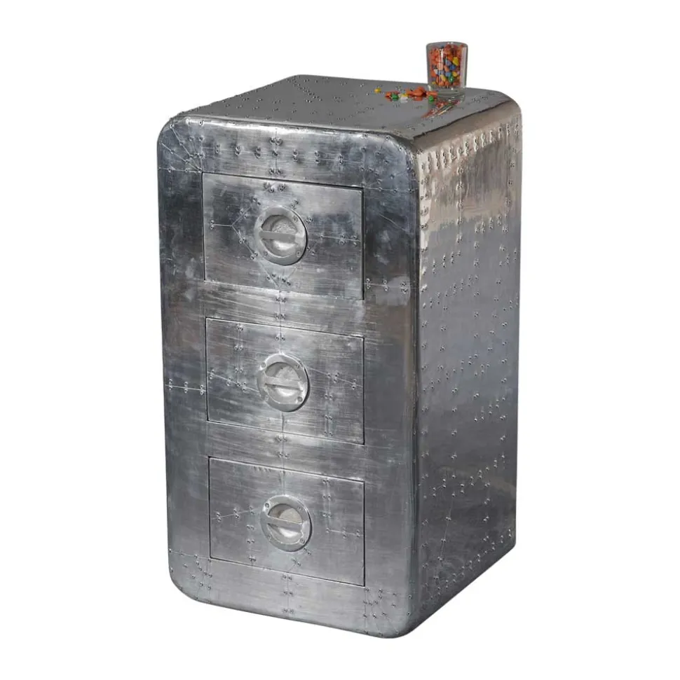 Die Oberfläche unserer Schubladenkommode ist komplett mit Aluminium beschlagen und mit auffälligen Zierschrauben versehen – eine Hommage an die mutigen Designs des Flugzeugbaus. Diese einzigartigen Details machen die „Pilot“ zu einem echten Eyecatcher in jedem Raum. Die abgerundeten Korpuskanten, umrahmt von feinem Metall, verstärken die industrielle Anmutung und sorgen zugleich für eine geschmeidige, sichere Haptik.