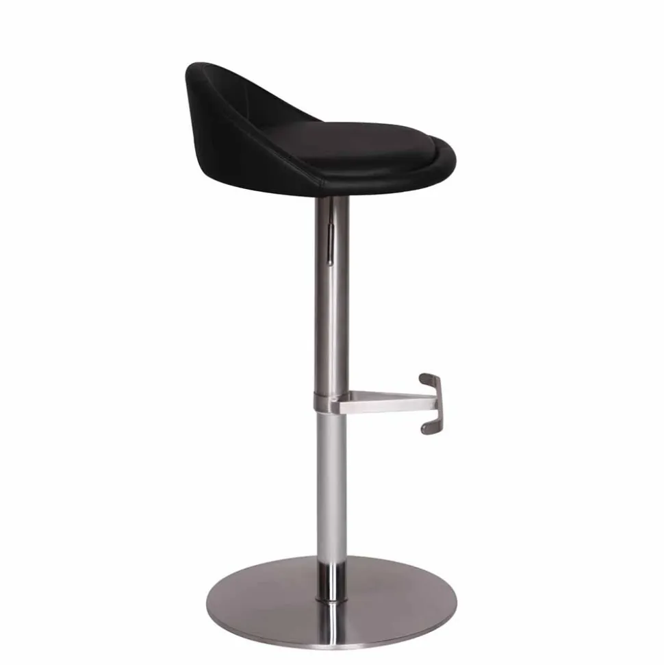 Die solide Säule und die runde Bodenplatte aus gebürstetem Edelstahl verleihen dem Barhocker nicht nur eine edle Optik, sondern auch hervorragende Stabilität bis zu einer Belastbarkeit von 110 kg. Das kühle Metall harmoniert perfekt mit dem schwarzen Kunstleder und sorgt für einen modernen, luxuriösen Gesamteindruck.