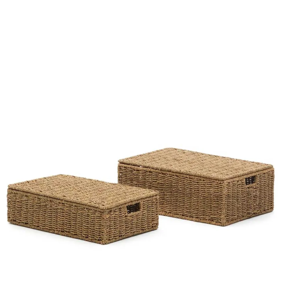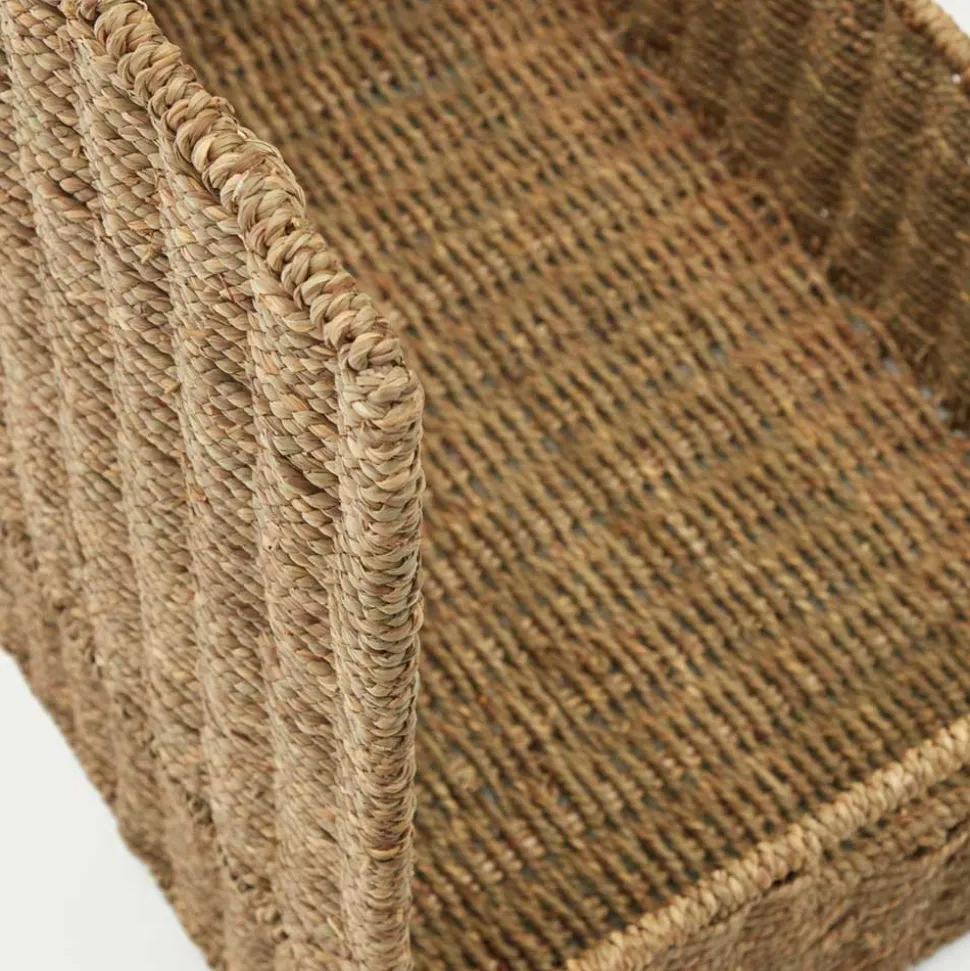 Die Kisten bestehen aus hochwertigem Seegrasgeflecht, das von Hand gefertigt wird. Jede Kiste ist ein Unikat, mit individuellen Unterschieden in Form, Farbe und Struktur, was ihren rustikalen Charme unterstreicht. Der Innenrahmen aus Metall sorgt für Stabilität und Langlebigkeit.