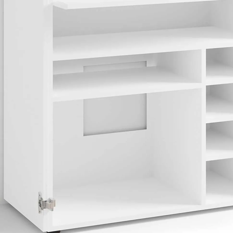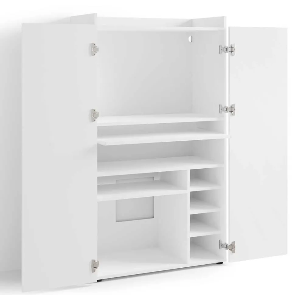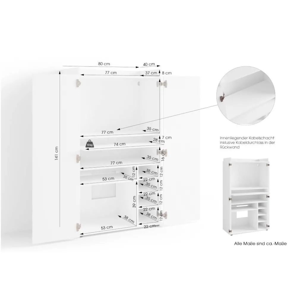 Hinter den zwei dezent integrierten Drehtüren offenbart sich ein cleveres Innenleben: Vier verstellbare Einlegeböden bieten ausreichend Platz für Dokumente, Technik oder Bürozubehör. Der Tastaturauszug mit einer Tiefe von 30 cm ermöglicht ergonomisches Arbeiten und lässt sich bei Nichtgebrauch einfach zurückschieben – ideal für ein aufgeräumtes Gesamtbild. Für eine geordnete Kabelführung sorgt ein Kabeldurchlass in der Rückwand. Wichtig: Der Schrank sollte zur Kippsicherung zusätzlich an der Wand befestigt werden.