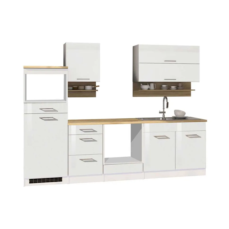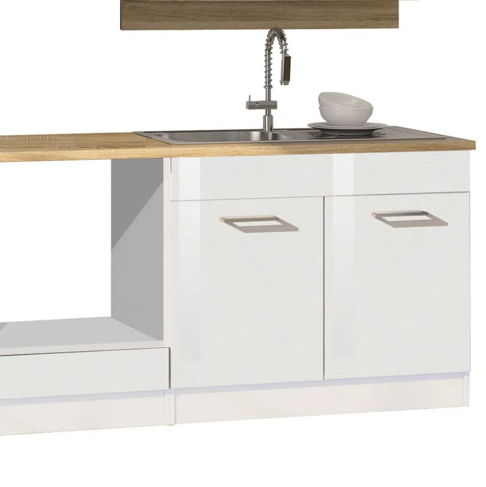 Made in Germany – dieser Ausdruck steht für höchste Qualitätsstandards, auf die Sie sich bei der Küchenzeile „Cuneo“ jederzeit verlassen können. Diese moderne Küchenzeile verbindet zeitgemäßes Design mit durchdachter Funktionalität und wird so zum Herzstück Ihrer Küche. Die Kombination aus weißen Hochglanz-Fronten und der natürlichen Holzoptik der Sonoma Eiche schafft eine stilvolle und zugleich einladende Atmosphäre, die Ihre Küche in neuem Glanz erstrahlen lässt.