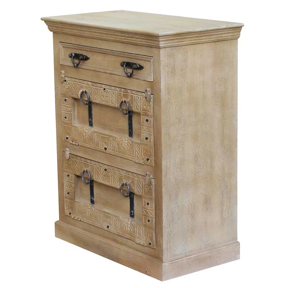 Nicht nur ästhetisch ansprechend, sondern auch äußerst praktisch im Eingangsbereich – der Schuhschrank „Abid“ bietet die ideale Lösung, um Ihre Schuhe stilvoll zu verstauen. Die Front des Schrankes ist mit einer dekorativen Reliefstruktur und antik wirkenden Metallbeschlägen verziert, die für einen zusätzlichen Blickfang sorgen.