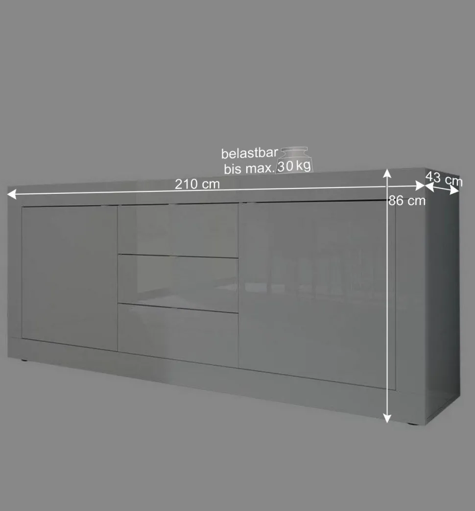 Mit Maßen von 210 cm Breite, 86 cm Höhe und 43 cm Tiefe bietet das Sideboard „Sogno“ reichlich Stauraum. Die Außentüren verbergen jeweils einen Einlegeboden, der bis zu 10 kg belasten kann, ideal für Bücher, Geschirr oder Dekorationsartikel. Die Deckplatte kann mit bis zu 30 kg beladen werden – perfekt für Ihre schönsten Erinnerungsstücke oder eine stilvolle Tischlampe. In den drei mittigen Schubkästen, die auf robusten Metallauszügen gleiten, finden kleinere Gegenstände ihren Platz. Und dank der minimalistischen Metallgriffe ist die Handhabung ein Kinderspiel.