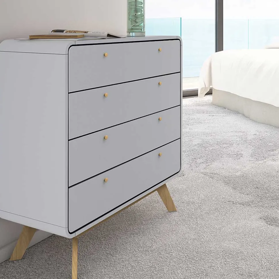 Das standfeste Untergestell aus MDF mit leicht nach außen geneigten Füßen verleiht der Kommode nicht nur eine moderne Optik, sondern auch eine ausgezeichnete Stabilität. Der Abstand zwischen den Beinen bietet zudem eine optische Leichtigkeit, die den skandinavischen Charme perfekt unterstreicht.