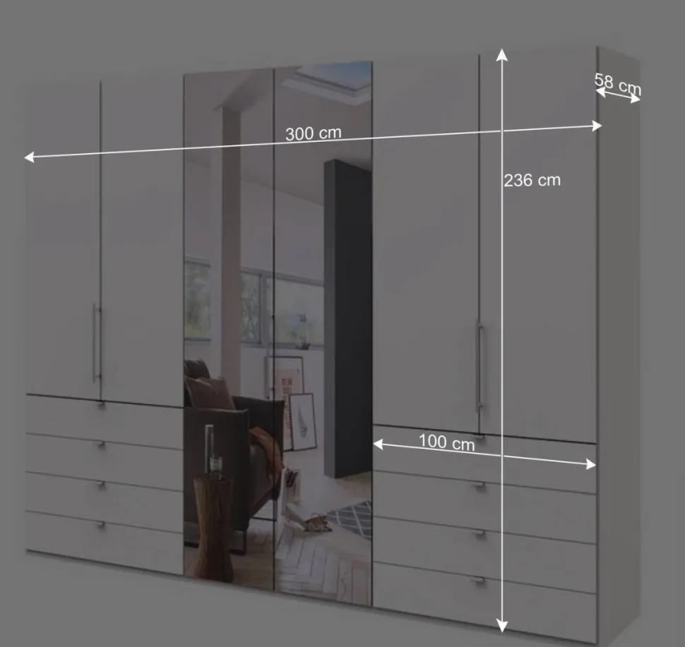 Mit beeindruckenden Maßen von 300 cm Breite, 236 cm Höhe und einer Tiefe von 58 cm liefert „Donpiave“ nicht nur optisch, sondern auch in Sachen Stauraum Großes. Die drei Panorama-Falttüren, mit ihrer Sechs-Türen-Optik, bieten einen leichten Zugang zu Ihrem gesamten Kleidersortiment, ohne dabei wertvollen Platz in Ihrem Raum zu beanspruchen. Die mittleren Türfronten zieren praktische Ganzkörperspiegel aus Parsol-Bronze, die das Zimmer optisch vergrößern und eine elegante Note hinzufügen.