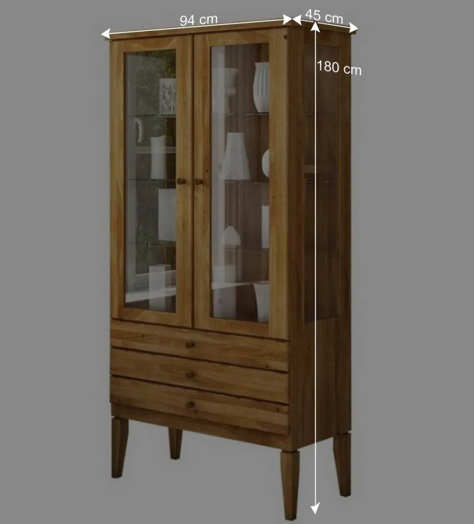 Mit einer Stärke von 2,5 cm bietet die Deckplatte der Vitrine nicht nur eine stabile Abstellfläche, sondern auch ein raffiniertes Designelement. Die profilierter Kante verleiht dem Möbelstück eine zusätzliche Kontur und verstärkt den hochwertigen Eindruck. Die Abmessungen von 94 cm Breite, 180 cm Höhe und 45 cm Tiefe sorgen für ausreichend Stauraum, um Ihre Lieblingsstücke angemessen zu präsentieren.