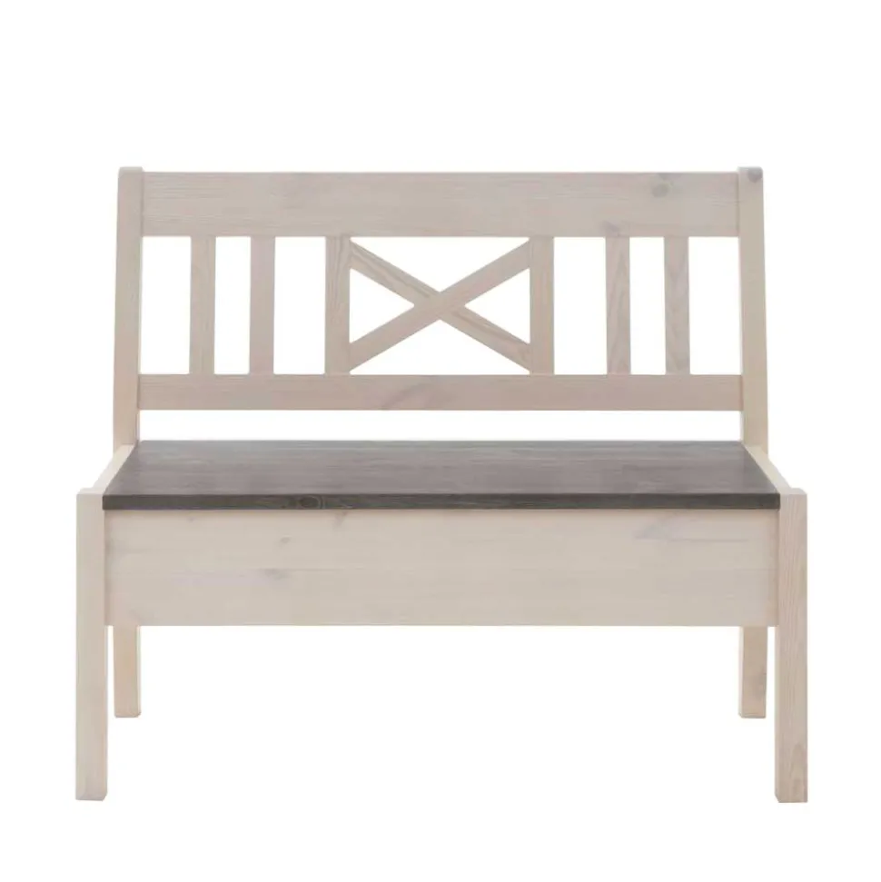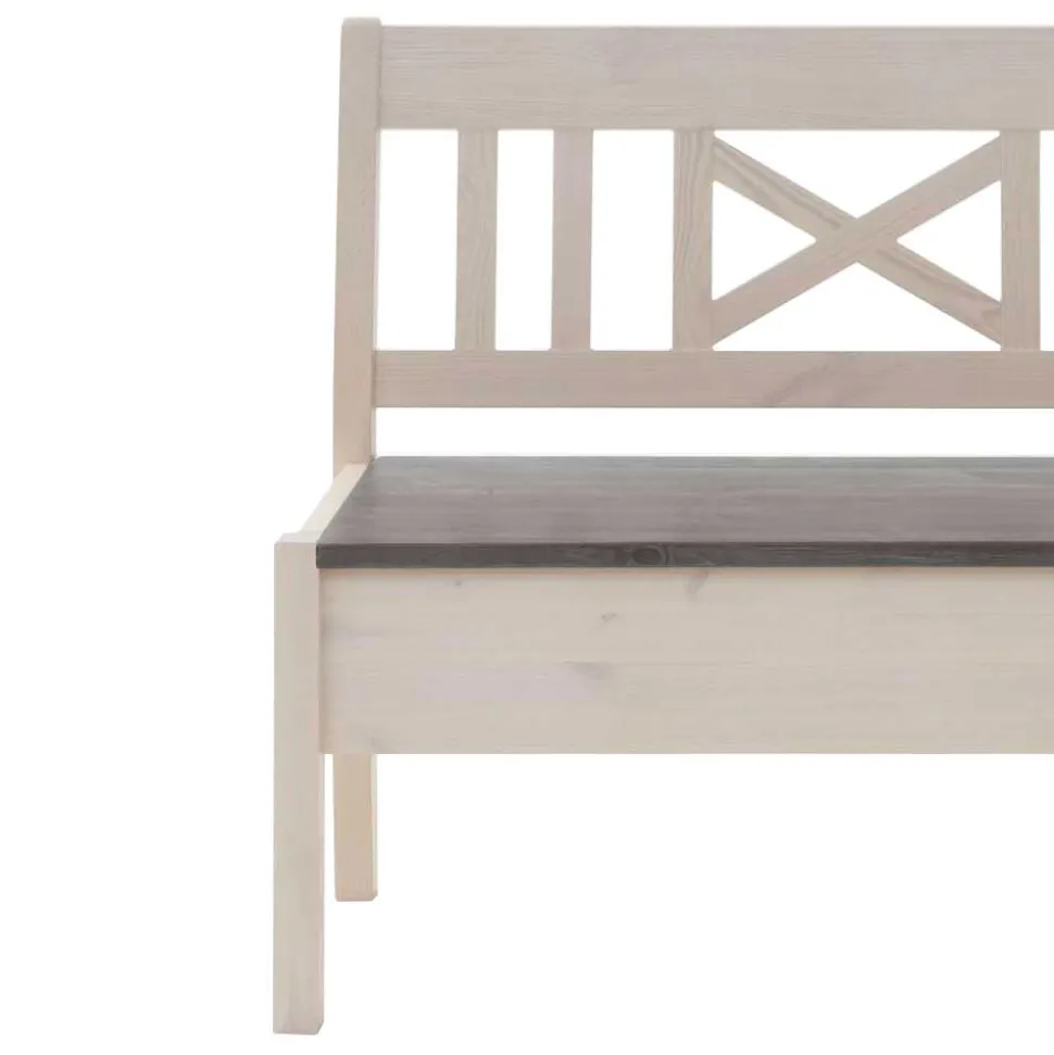 Die Kombination aus weiß lackierten Oberflächen und einer grau gebeizten Sitzfläche verleiht der Bank eine stilvolle, moderne Optik, die sich harmonisch in verschiedene Wohnkonzepte einfügt. Die durchscheinende Holzmaserung unterstreicht den natürlichen Charakter und bringt ein Stück Natur in Ihre vier Wände. Doch nicht nur optisch ist die Stauraumbank „Yoan“ ein Highlight – sie bietet auch eine clevere Stauraumlösung: Unter der aufklappbaren Sitzfläche verbirgt sich ein geräumiges Fach, das ideal für Kissen, Decken oder Alltagsgegenstände geeignet ist.