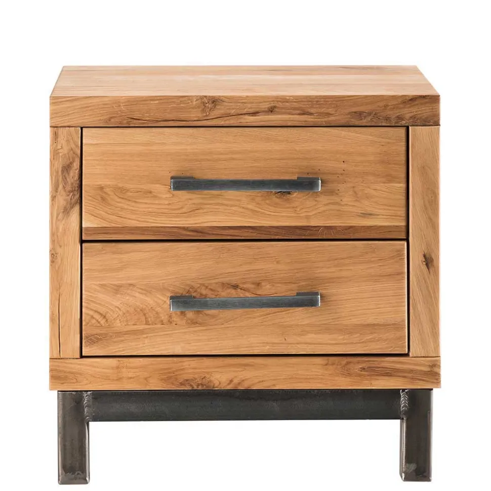 Eine kleine Kommode im Format 50x50x38 cm, welche sich perfekt unterhalb des Wandspiegels mit Holzrahmen im Format 50x140x2 cm, komplettiert das Garderobenmöbel Set aus Wildeiche und Eisen Mulcian. Die Kommode verfügt über zwei Schubladen auf Metallschienen mit Soft-Close-Funktion.