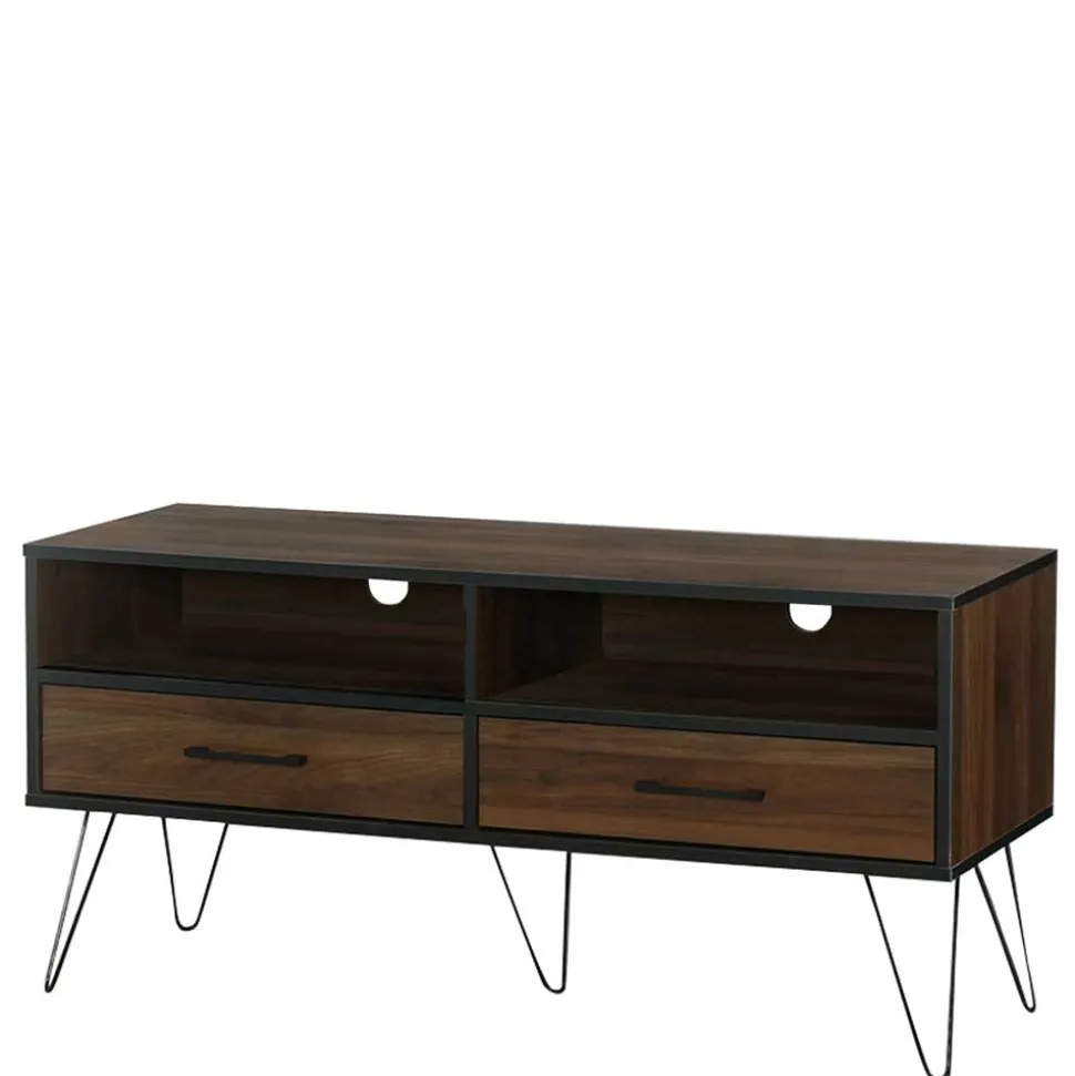 Mit dem TV Board „Hamidy“ holen Sie sich ein kompaktes Möbelstück mit moderner Eleganz und funktionalen Details in Ihr Zuhause. Die Farbkombination aus Braun und Schwarz sowie die filigrane Hairpinform des Metallgestells verleihen dem Board eine charmante Retro-Optik. Dank der durchdachten Gestaltung bietet es nicht nur Platz für Ihre Mediengeräte, sondern auch praktischen Stauraum für Zubehör.